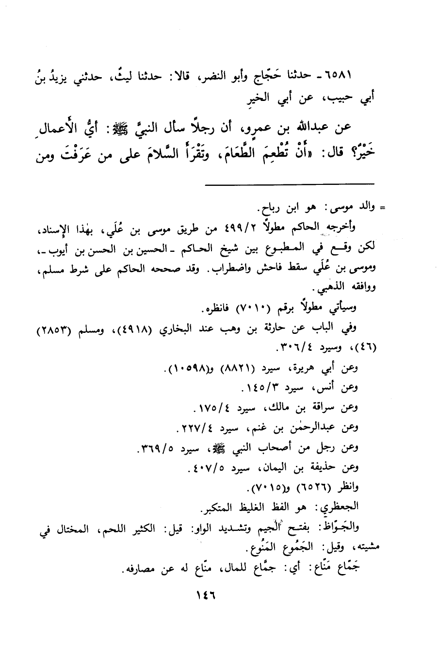 ٦٥٨١ - حَدَّثَنَا حَجَّاجٌ، وَأَبُو النَّضْرِ قَالَا: حَدَّثَنَا لَيْثٌ، حَدَّثَنِي يَزِيدُ بْنُ أَبِي حَبِيبٍ، عَنْ أَبِي الْخَيْرِ، عَنْ عَبْدِ اللهِ بْنِ عَمْرٍو، أَنَّ رَجُلًا سَأَلَ النَّبِيَّ صَلَّى اللهُ عَلَيْهِ وَسَلَّمَ أَيُّ الْأَعْمَالِ خَيْرٌ؟ قَالَ: " أَنْ تُطْعِمَ الطَّعَامَ، وَتَقْرَأَ السَّلَامَ عَلَى مَنْ عَرَفْتَ، وَمَنْ