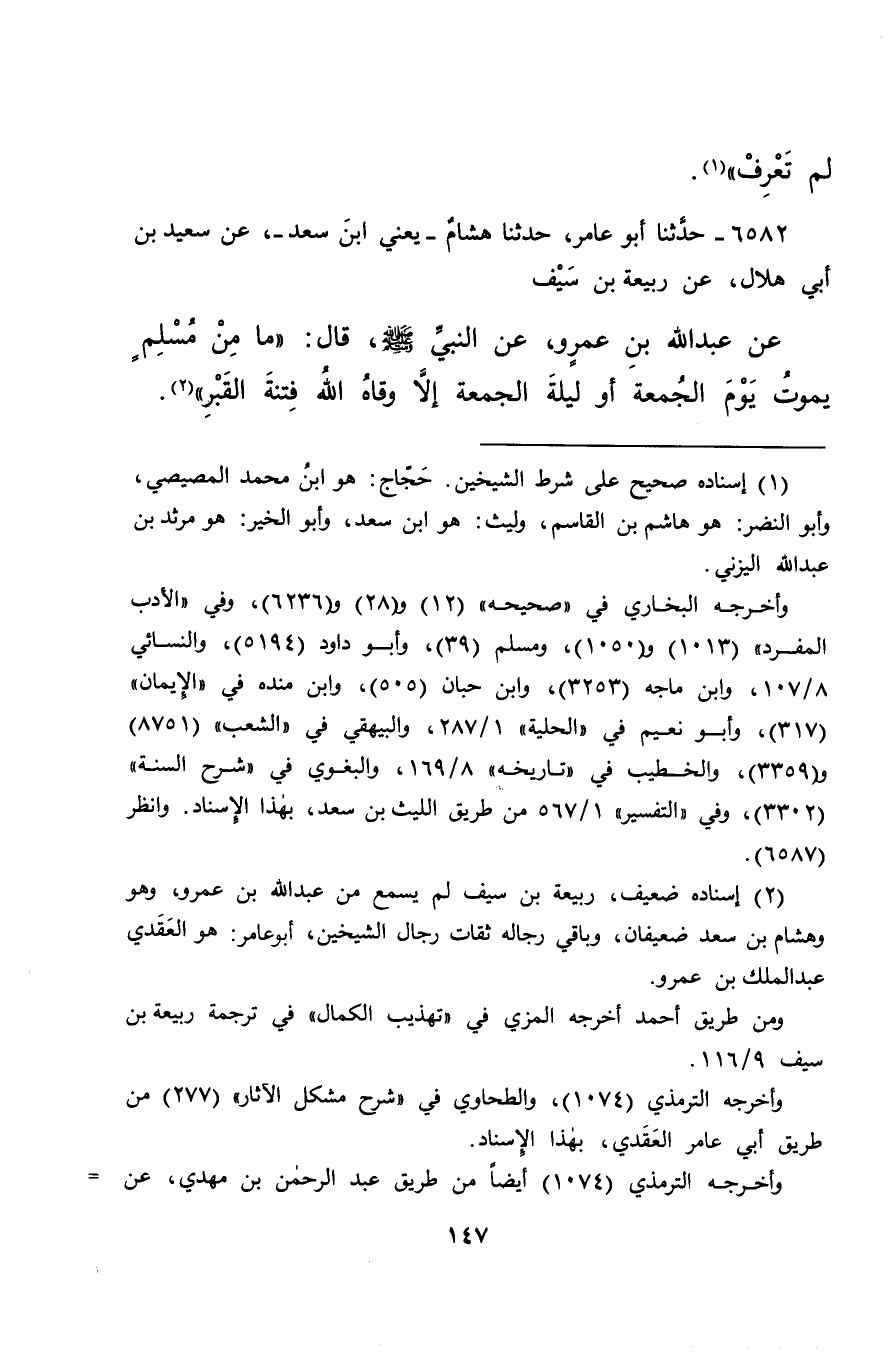 ٦٥٨٢ - حَدَّثَنَا أَبُو عَامِرٍ، حَدَّثَنَا هِشَامٌ يَعْنِي ابْنَ سَعْدٍ، عَنْ سَعِيدِ بْنِ أَبِي هِلَالٍ، عَنْ رَبِيعَةَ بْنِ سَيْفٍ، عَنْ عَبْدِ اللهِ بْنِ عَمْرٍو، عَنِ النَّبِيِّ صَلَّى اللهُ عَلَيْهِ وَسَلَّمَ قَالَ: " مَا مِنْ مُسْلِمٍ يَمُوتُ يَوْمَ الْجُمُعَةِ أَوْ لَيْلَةَ الْجُمُعَةِ إِلَّا وَقَاهُ اللهُ فِتْنَةَ الْقَبْرِ " (٢)