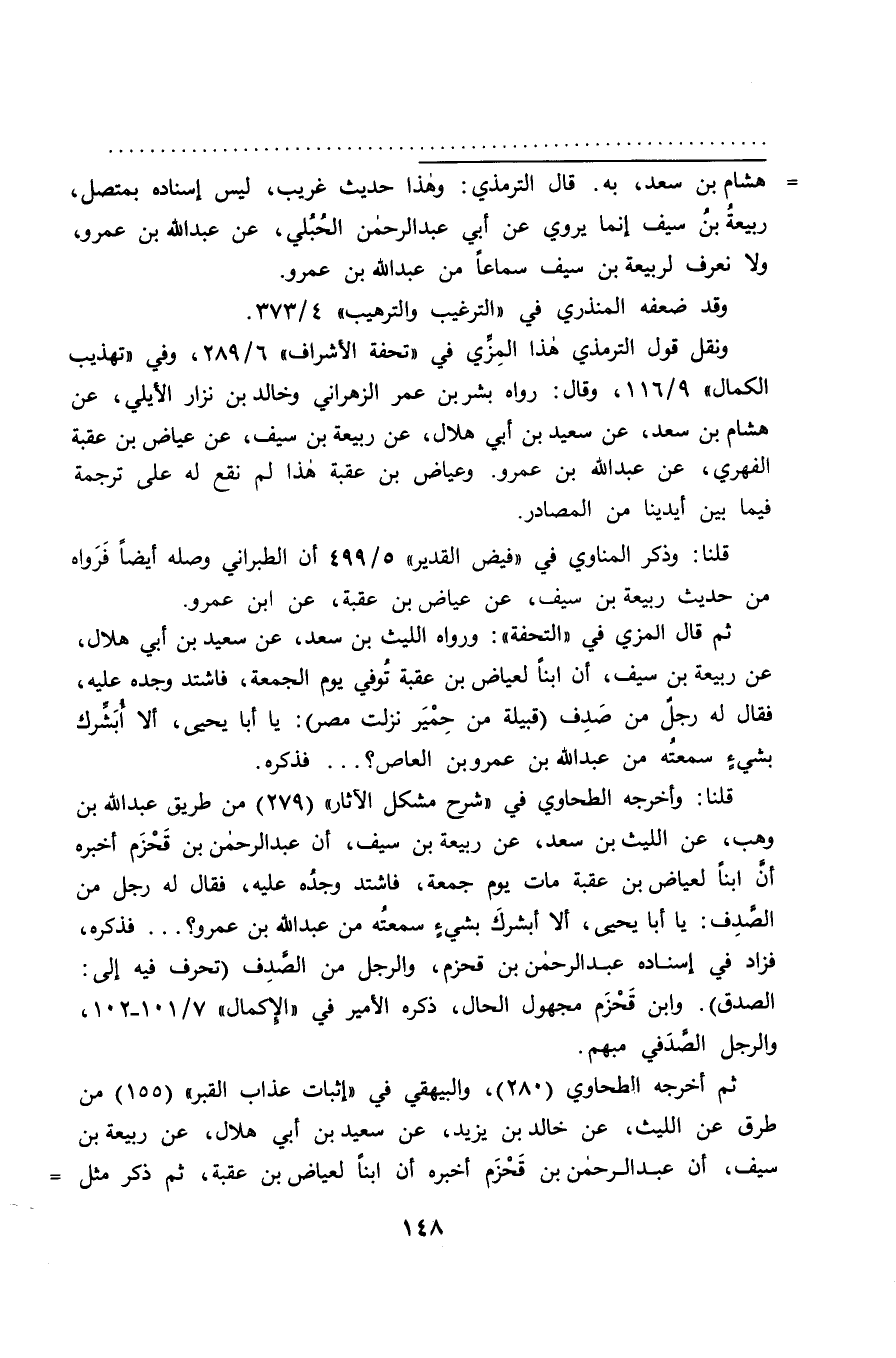 ثم قال المزي في "التحفة": ورواه الليث بن سعد، عن سعيد بن أبي هلال، عن ربيعة بن سيف، أن ابناً لعياض بن عقبة تُوفي يوم الجمعة، فاشتد وجده عليه، فقال له رجل من صدف (قبيلة من حمْير نزلت مصر) : يا أبا يحيى، ألا أبشرك بشيء سمعته من عبد الله بن عمرو بن العاص؟ ... فذكره.