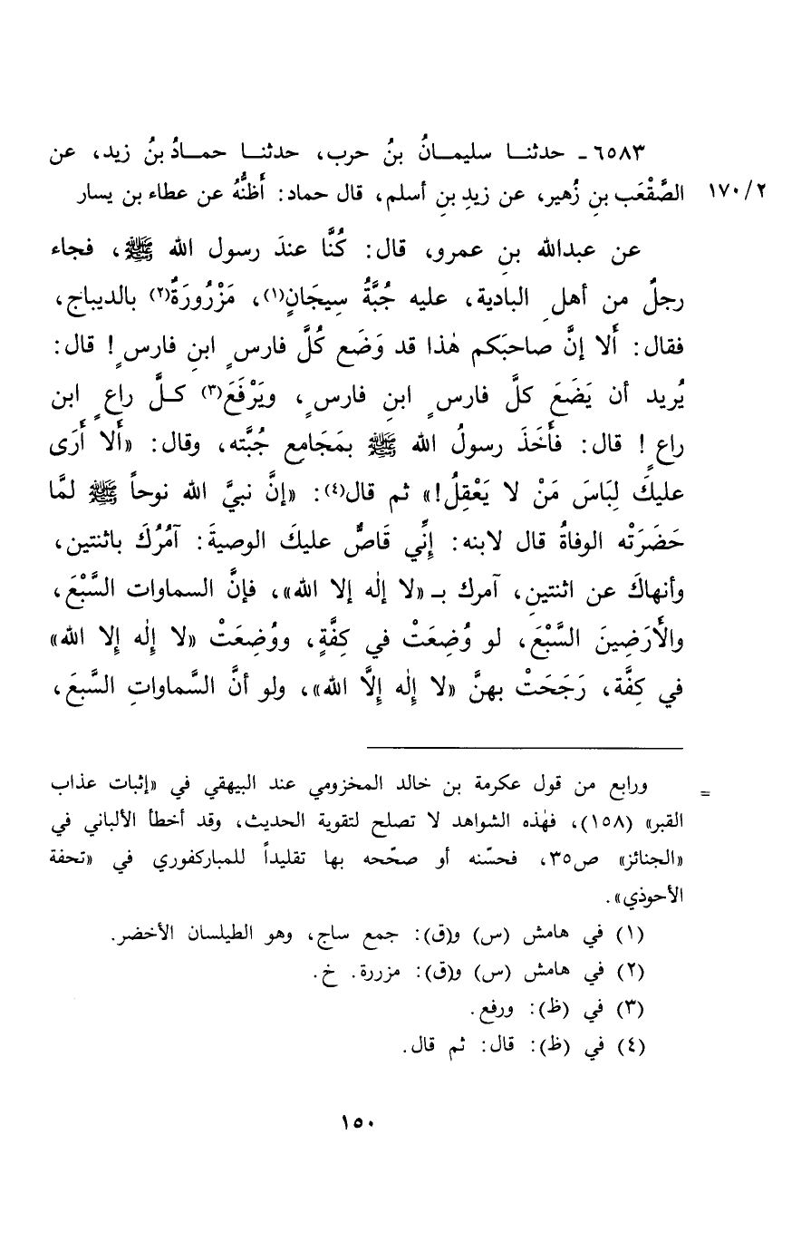 ٦٥٨٣ - حَدَّثَنَا سُلَيْمَانُ بْنُ حَرْبٍ، حَدَّثَنَا حَمَّادُ بْنُ زَيْدٍ، عَنِ الصَّقْعَبِ بْنِ زُهَيْرٍ، عَنْ زَيْدِ بْنِ أَسْلَمَ، قَالَ حَمَّادٌ، أَظُنُّهُ عَنْ عَطَاءِ بْنِ يَسَارٍ، عَنْ عَبْدِ اللهِ بْنِ عَمْرٍو، قَالَ: كُنَّا عِنْدَ رَسُولِ اللهِ صَلَّى اللهُ عَلَيْهِ وَسَلَّمَ، فَجَاءَ رَجُلٌ مِنْ أَهْلِ الْبَادِيَةِ، عَلَيْهِ جُبَّةٌ سِيجَانٍ (١) مَزْرُورَةٌ (٢) بِالدِّيبَاجِ، فَقَالَ: أَلَا إِنَّ صَاحِبَكُمْ هَذَا قَدْ وَضَعَ كُلَّ فَارِسٍ ابْنِ فَارِسٍ قَالَ: يُرِيدُ أَنْ يَضَعَ كُلَّ فَارِسٍ ابْنِ فَارِسٍ، وَيَرْفَعَ (٣) كُلَّ رَاعٍ ابْنِ رَاعٍ قَالَ: فَأَخَذَ رَسُولُ اللهِ صَلَّى اللهُ عَلَيْهِ وَسَلَّمَ بِمَجَامِعِ جُبَّتِهِ، وَقَالَ: " أَلَا أَرَى عَلَيْكَ لِبَاسَ مَنْ لَا يَعْقِلُ " ثُمَّ قَالَ (٤) : " إِنَّ نَبِيَّ اللهِ نُوحًا صَلَّى اللهُ عَلَيْهِ وَسَلَّمَ لَمَّا حَضَرَتْهُ الْوَفَاةُ قَالَ لِابْنِهِ: إِنِّي قَاصٌّ عَلَيْكَ الْوَصِيَّةَ: آمُرُكَ بِاثْنَتَيْنِ، وَأَنْهَاكَ عَنِ اثْنَتَيْنِ، آمُرُكَ بِلَا إِلَهَ إِلَّا اللهُ، فَإِنَّ السَّمَوَاتِ السَّبْعَ، وَالْأَرْضِينَ السَّبْعَ، لَوْ وُضِعَتْ فِي كِفَّةٍ، وَوُضِعَتْ لَا إِلَهَ إِلَّا اللهُ فِي كِفَّةٍ، رَجَحَتْ بِهِنَّ لَا إِلَهَ إِلَّا اللهُ، وَلَوْ أَنَّ السَّمَوَاتِ السَّبْعَ،