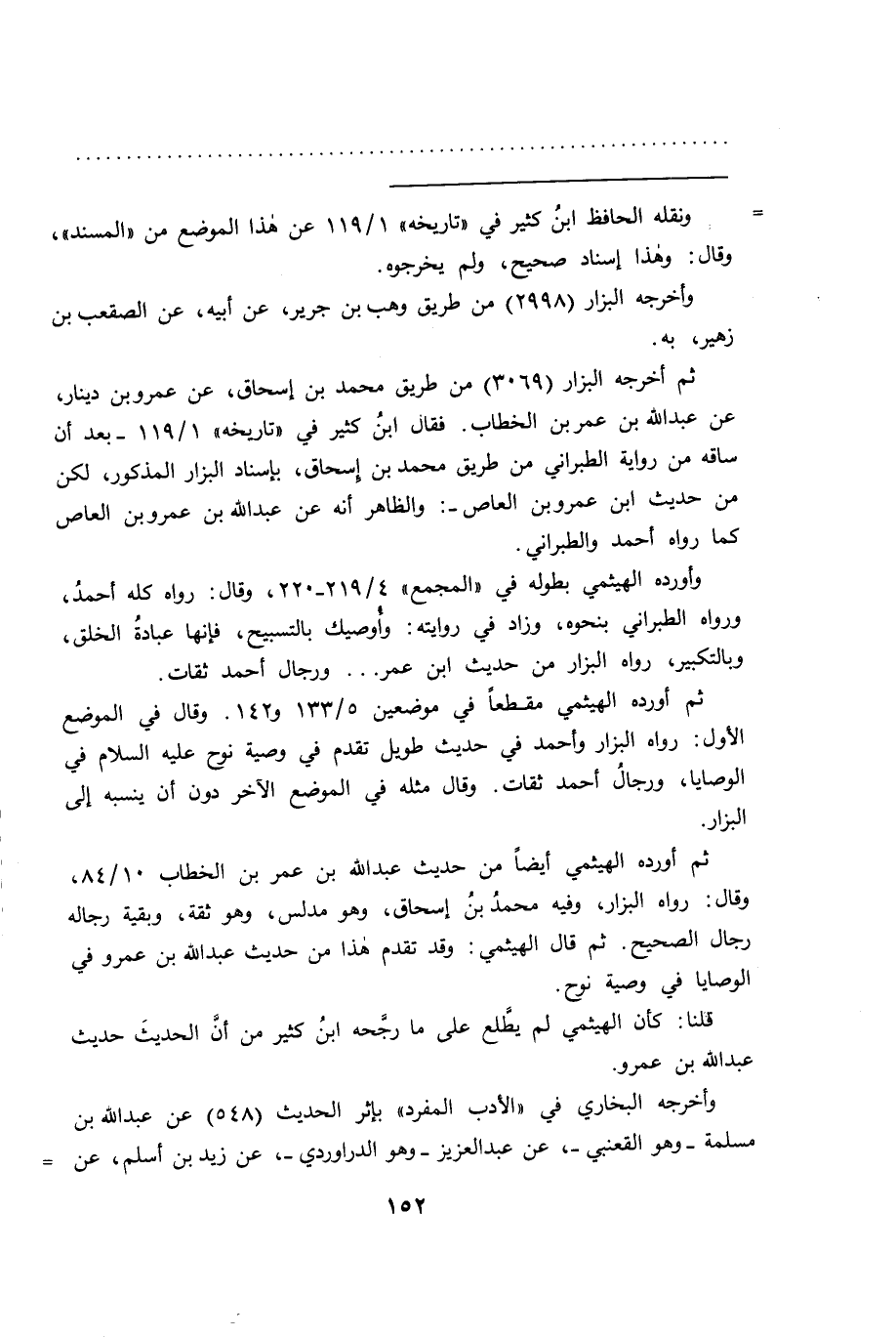 ثم أورده الهيثمي أيضاً من حديث عبد الله بن عمر بن الخطاب ١٠/٨٤، وقال: رواه البزار، وفيه محمدُ بنُ إسحاق، وهو مدلس، وهو ثقة، وبقية رجاله رجال الصحيح. ثم قال الهيثمي: وقد تقدم هذا من حديث عبد الله بن عمرو في الوصايا في وصية نوح.