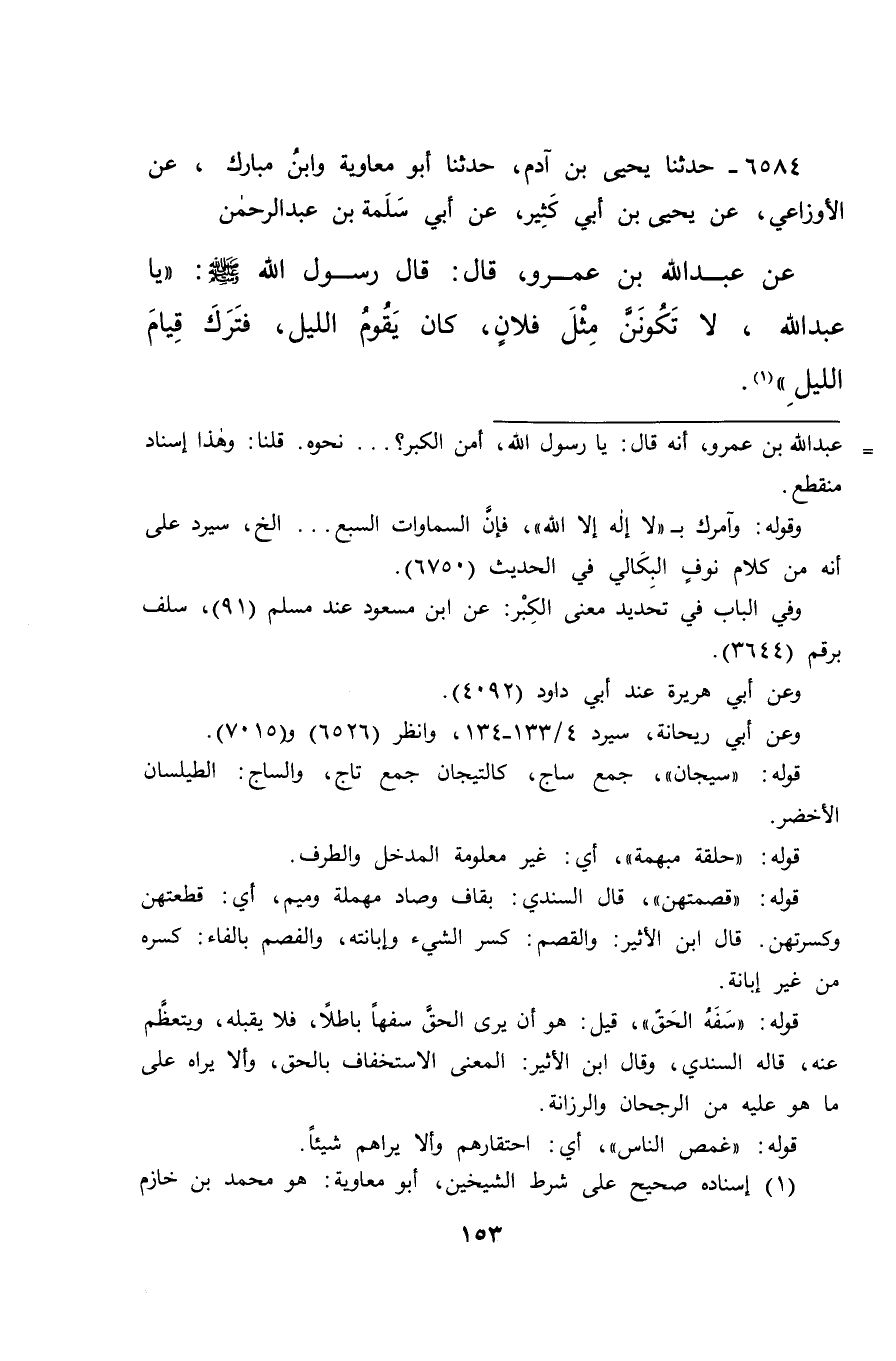 ٦٥٨٤ - حَدَّثَنَا يَحْيَى بْنُ آدَمَ، حَدَّثَنَا أَبُو مُعَاوِيَةَ، وَابْنُ مُبَارَكٍ، عَنِ الْأَوْزَاعِيِّ، عَنْ يَحْيَى بْنِ أَبِي كَثِيرٍ، عَنْ أَبِي سَلَمَةَ بْنِ عَبْدِ الرَّحْمَنِ، عَنْ عَبْدِ اللهِ بْنِ عَمْرٍو، قَالَ: قَالَ رَسُولُ اللهِ صَلَّى اللهُ عَلَيْهِ وَسَلَّمَ: " يَا عَبْدَ اللهِ، لَا تَكُونَنَّ مِثْلَ فُلَانٍ، كَانَ يَقُومُ اللَّيْلَ، فَتَرَكَ قِيَامَ اللَّيْلِ " (١)