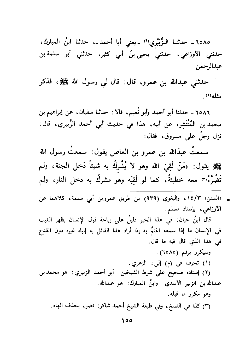 ٦٥٨٥ - حَدَّثَنَا الزُّبَيْرِيُّ (١) يَعْنِي أَبَا أَحْمَدَ، حَدَّثَنَا ابْنُ الْمُبَارَكِ، حَدَّثَنِي الْأَوْزَاعِيُّ، حَدَّثَنِي يَحْيَى بْنُ أَبِي كَثِيرٍ، حَدَّثَنِي أَبُو سَلَمَةَ بْنُ عَبْدِ الرَّحْمَنِ، حَدَّثَنِي عَبْدُ اللهِ بْنُ عَمْرٍو، قَالَ: قَالَ لِي رَسُولُ اللهِ صَلَّى اللهُ عَلَيْهِ وَسَلَّمَ فَذَكَرَ مِثْلَهُ (٢)