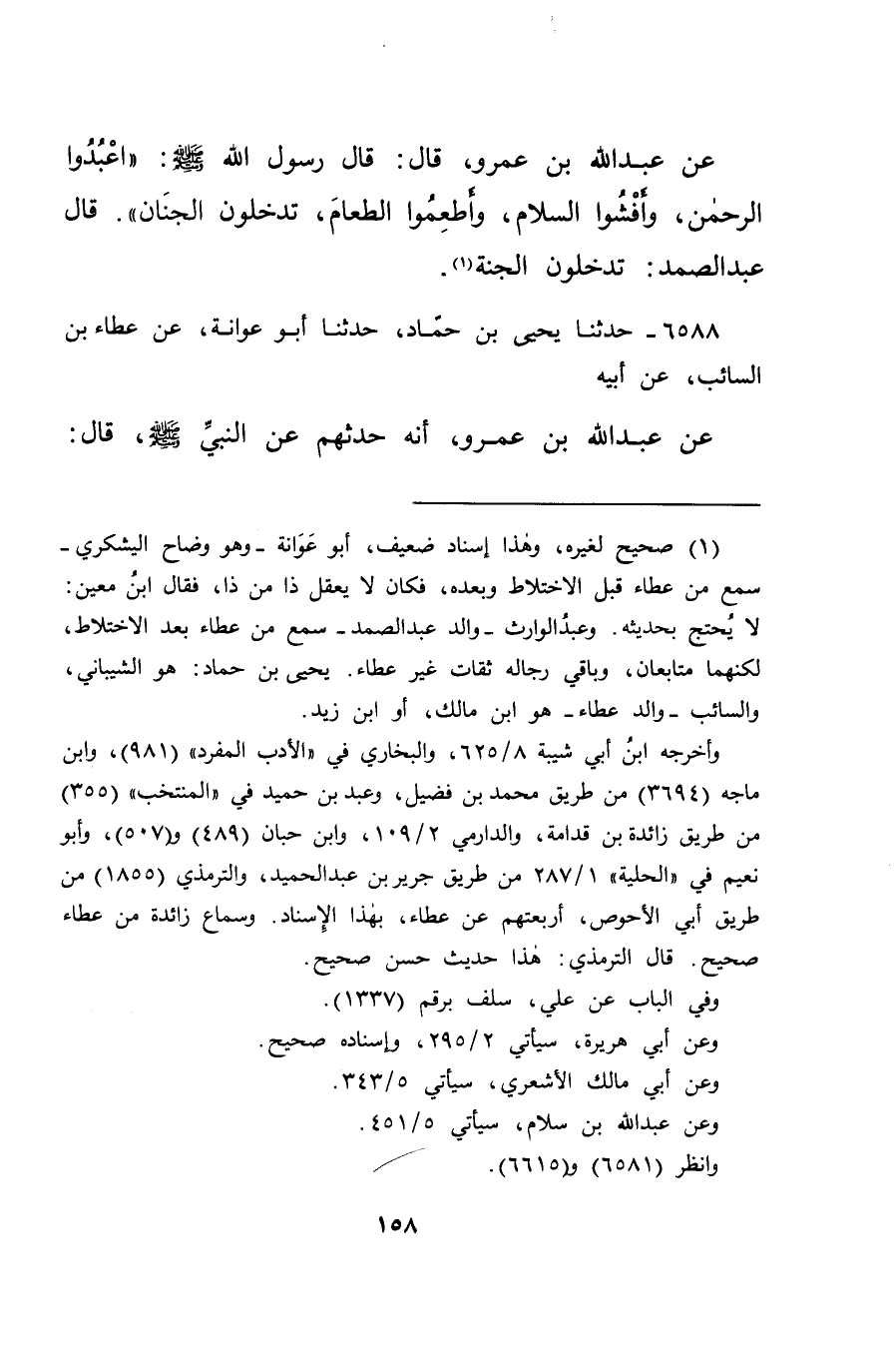 عَنْ عَبْدِ اللهِ بْنِ عَمْرٍو، قَالَ: قَالَ رَسُولُ اللهِ صَلَّى اللهُ عَلَيْهِ وَسَلَّمَ: " اعْبُدُوا الرَّحْمَنَ، وَأَفْشُوا السَّلَامَ، وَأَطْعِمُوا الطَّعَامَ، تَدْخُلُونَ الْجِنَانَ " قَالَ عَبْدُ الصَّمَدِ: " تَدْخُلُونَ الْجَنَّةَ " (١)