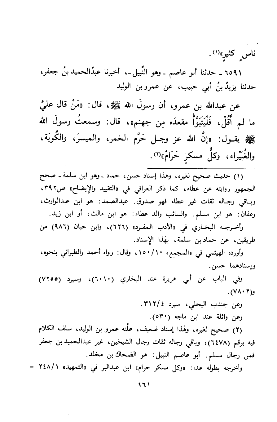 ٦٥٩١ - حَدَّثَنَا أَبُو عَاصِمٍ وَهُوَ النَّبِيلُ، أَخْبَرَنَا عَبْدُ الْحَمِيدِ بْنُ جَعْفَرٍ، حَدَّثَنَا يَزِيدُ بْنُ أَبِي حَبِيبٍ، عَنْ عَمْرِو بْنِ الْوَلِيدِ، عَنْ عَبْدِ اللهِ بْنِ عَمْرٍو، أَنَّ رَسُولَ اللهِ صَلَّى اللهُ عَلَيْهِ وَسَلَّمَ قَالَ: " مَنْ قَالَ عَلَيَّ مَا لَمْ أَقُلْ، فَلْيَتَبَوَّأْ مَقْعَدَهُ مِنْ جَهَنَّمَ "