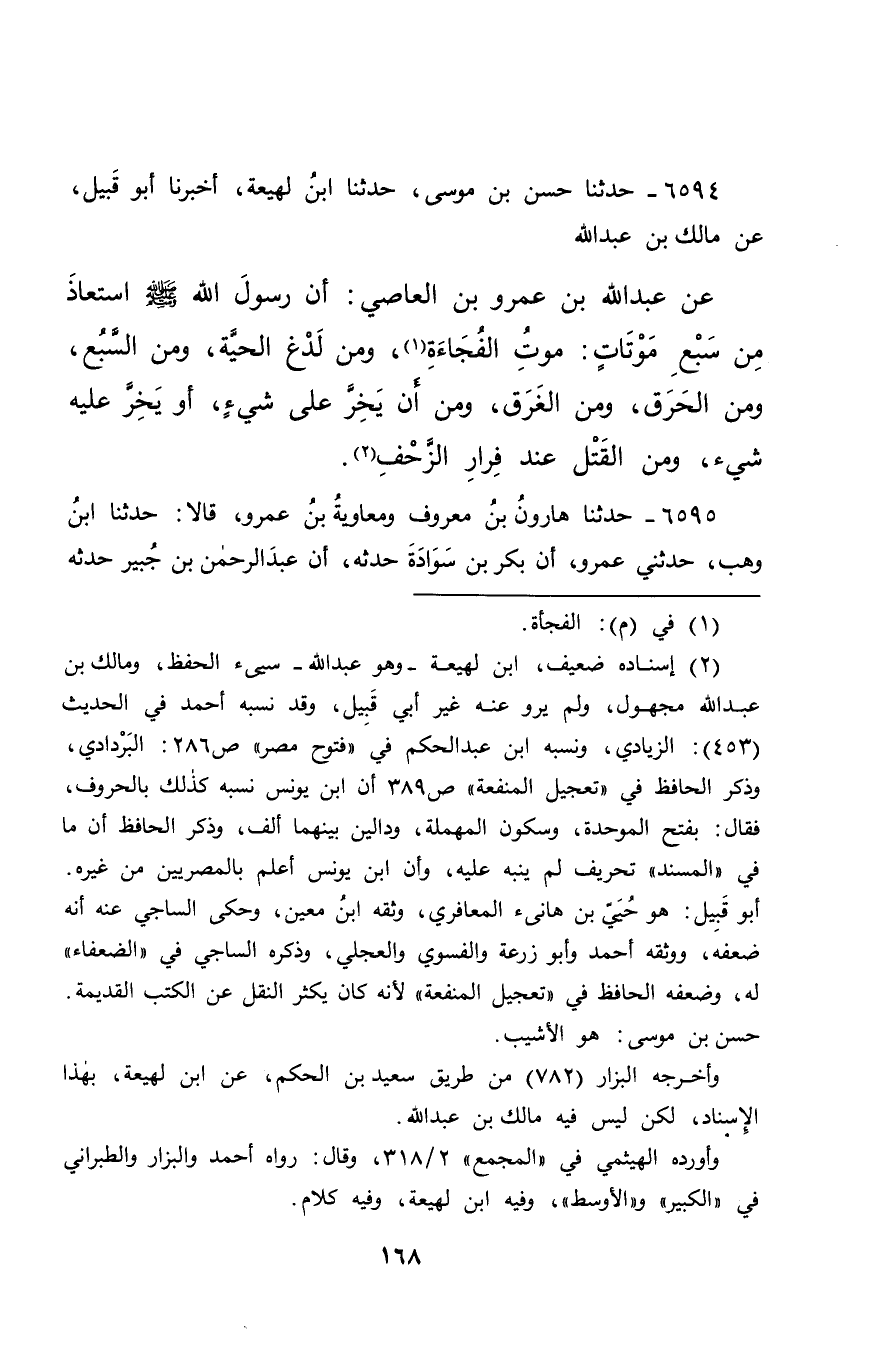 ٦٥٩٤ - حَدَّثَنَا حَسَنُ بْنُ مُوسَى، حَدَّثَنَا ابْنُ لَهِيعَةَ، أَخْبَرَنَا أَبُو قَبِيلٍ، عَنْ مَالِكِ بْنِ عَبْدِ اللهِ، عَنْ عَبْدِ اللهِ بْنِ عَمْرِو بْنِ الْعَاصِي: " أَنَّ رَسُولَ اللهِ صَلَّى اللهُ عَلَيْهِ وَسَلَّمَ اسْتَعَاذَ مِنْ سَبْعِ مَوْتَاتٍ: مَوْتِ الْفُجَاءَةِ (١) ، وَمِنْ لَدْغِ الْحَيَّةِ، وَمِنَ السَّبُعِ، وَمِنَ الْحَرَقِ، وَمِنَ الْغَرَقِ، وَمِنْ أَنْ يَخِرَّ عَلَى شَيْءٍ، أَوْ يَخِرَّ عَلَيْهِ شَيْءٌ، وَمِنَ الْقَتْلِ عِنْدَ فِرَارِ الزَّحْفِ " (٢)