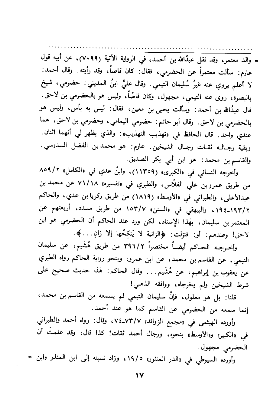 قلنا: بل هو معلول، فإن سليمان التيمي لم يسمعه من القاسم بن محمد، إنما سمعه من الحضرمي عن القاسم كما هو عند أحمد.