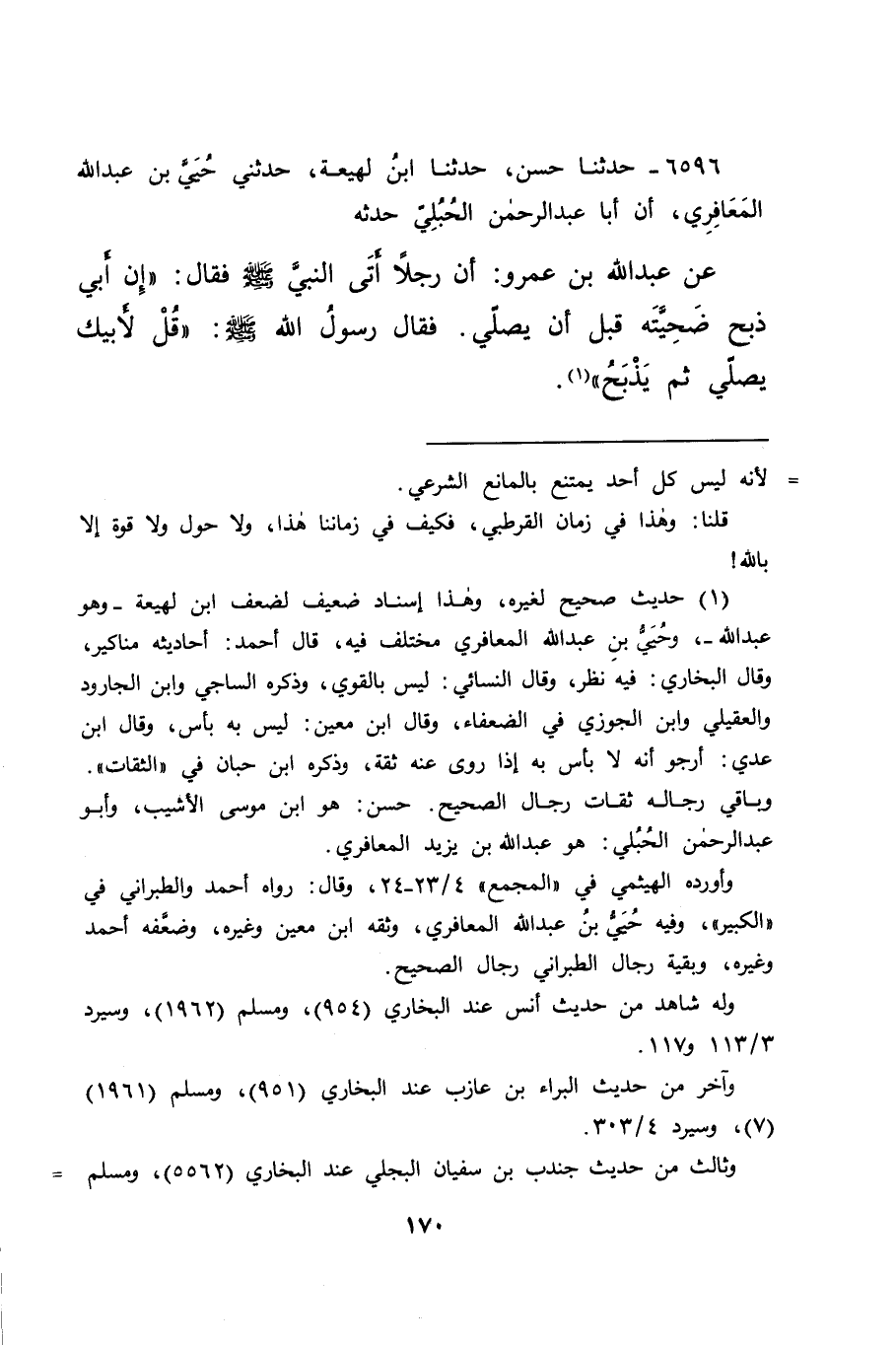 ٦٥٩٦ - حَدَّثَنَا حَسَنٌ، حَدَّثَنَا ابْنُ لَهِيعَةَ، حَدَّثَنِي حُيَيُّ بْنُ عَبْدِ اللهِ الْمَعَافِرِيُّ، أَنَّ أَبَا عَبْدِ الرَّحْمَنِ الْحُبُلِيَّ، حَدَّثَهُ عَنْ عَبْدِ اللهِ بْنِ عَمْرٍو: أَنَّ رَجُلًا أَتَى النَّبِيَّ صَلَّى اللهُ عَلَيْهِ وَسَلَّمَ فَقَالَ: إِنَّ أَبِي ذَبَحَ ضَحِيَّتَهُ قَبْلَ أَنْ يُصَلِّيَ، فَقَالَ رَسُولُ اللهِ صَلَّى اللهُ عَلَيْهِ وَسَلَّمَ: " قُلْ لِأَبِيكَ يُصَلِّي ثُمَّ يَذْبَحُ " (١)