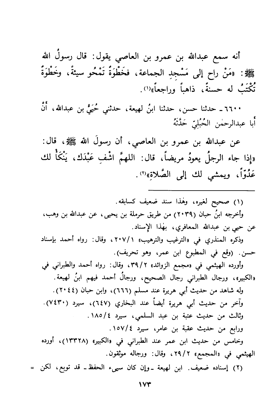 ٦٦٠٠ - حَدَّثَنَا حَسَنٌ، حَدَّثَنَا ابْنُ لَهِيعَةَ، حَدَّثَنِي حُيَيُّ بْنُ عَبْدِ اللهِ، أَنَّ أَبَا عَبْدِ الرَّحْمَنِ الْحُبُلِيَّ، حَدَّثَهُ عَنْ عَبْدِ اللهِ بْنِ عَمْرِو بْنِ الْعَاصِي، أَنَّ رَسُولَ اللهِ صَلَّى اللهُ عَلَيْهِ وَسَلَّمَ قَالَ: " إِذَا جَاءَ الرَّجُلُ يَعُودُ مَرِيضًا، قَالَ: اللهُمَّ اشْفِ عَبْدَكَ، يَنْكَأُ لَكَ عَدُوًّا، وَيَمْشِي لَكَ إِلَى الصَّلَاةِ " (٢)