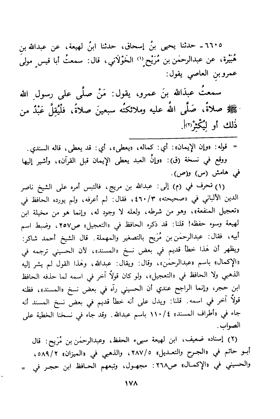 ٦٦٠٥ - حَدَّثَنَا يَحْيَى بْنُ إِسْحَاقَ، حَدَّثَنَا ابْنُ لَهِيعَةَ، عَنْ عَبْدِ اللهِ بْنِ هُبَيْرَةَ، عَنْ عَبْدِ الرَّحْمَنِ بْنِ مُرَيْحٍ (١) الْخَوْلَانِيِّ، قَالَ: سَمِعْتُ أَبَا قَيْسٍ، مَوْلَى عَمْرِو بْنِ الْعَاصِي، يَقُولُ: سَمِعْتُ عَبْدَ اللهِ بْنَ عَمْرٍو، يَقُولُ: " مَنْ صَلَّى عَلَى رَسُولِ اللهِ صَلَّى اللهُ عَلَيْهِ وَسَلَّمَ صَلَاةً صَلَّى الله عَلَيْهِ، وَمَلَائِكَتُهُ سَبْعِينَ صَلَاةً فَلْيُقِلَّ عَبْدٌ مِنْ ذَلِكَ أَوْ لِيُكْثِرْ " (٢)