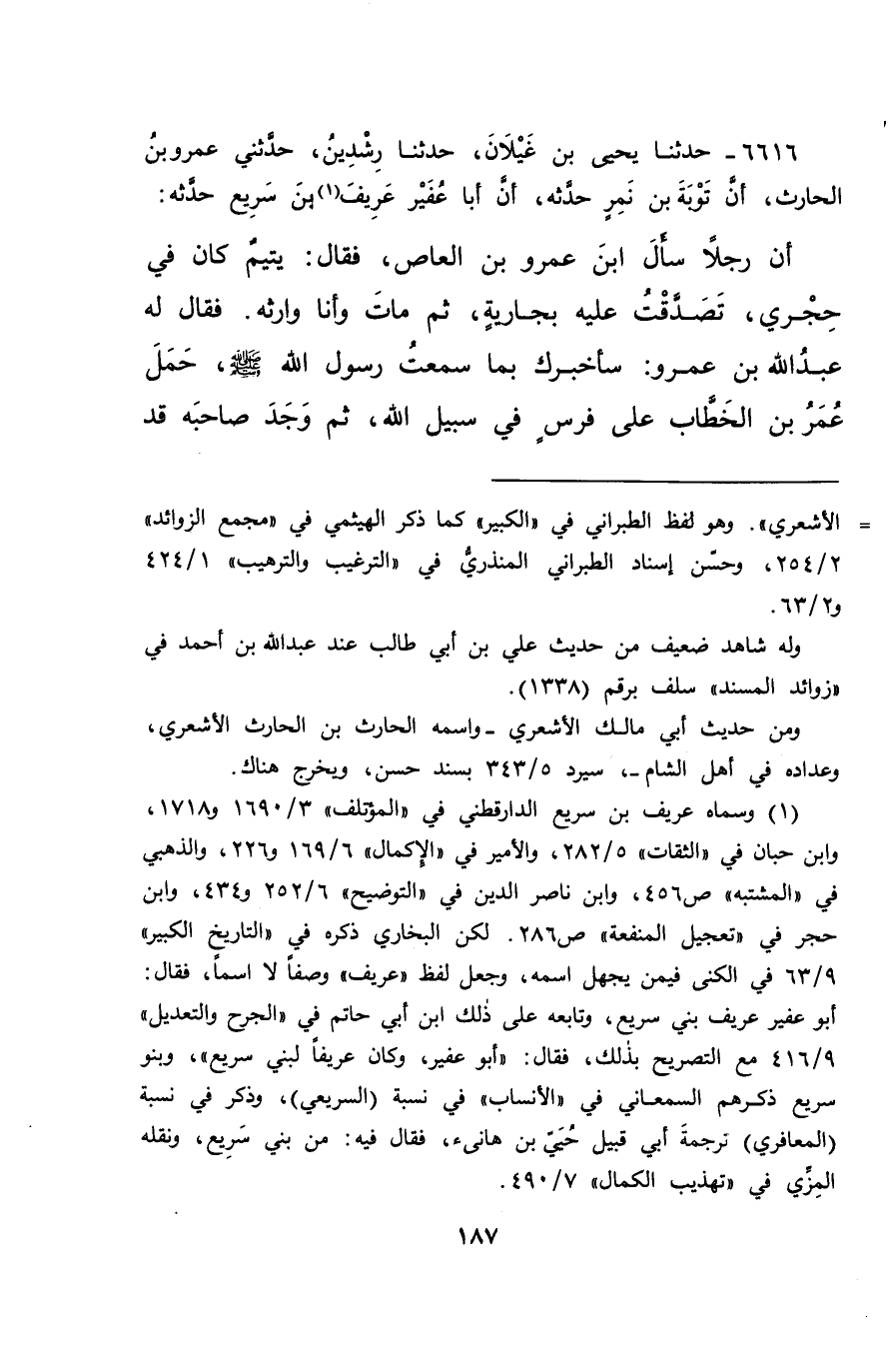 ٦٦١٦ - حَدَّثَنَا يَحْيَى بْنُ غَيْلَانَ، حَدَّثَنَا رِشْدِينُ، حَدَّثَنِي عَمْرُو بْنُ الْحَارِثِ، أَنَّ تَوْبَةَ بْنَ نَمِرٍ، حَدَّثَهُ أَنَّ أَبَا عُفَيْرٍ عَرِيفَ (١) بْنَ سَرِيعٍ، حَدَّثَهُ أَنَّ رَجُلًا سَأَلَ ابْنَ عَمْرِو بْنِ الْعَاصِي، فَقَالَ: يَتِيمٌ كَانَ فِي حَجْرِي، تَصَدَّقْتُ عَلَيْهِ بِجَارِيَةٍ، ثُمَّ مَاتَ وَأَنَا وَارِثُهُ، فَقَالَ لَهُ عَبْدُ اللهِ بْنُ عَمْرٍو: سَأُخْبِرُكَ بِمَا سَمِعْتُ رَسُولَ اللهِ صَلَّى اللهُ عَلَيْهِ وَسَلَّمَ، حَمَلَ عُمَرُ بْنُ الْخَطَّابِ عَلَى فَرَسٍ فِي سَبِيلِ اللهِ، ثُمَّ وَجَدَ صَاحِبَهُ قَدْ