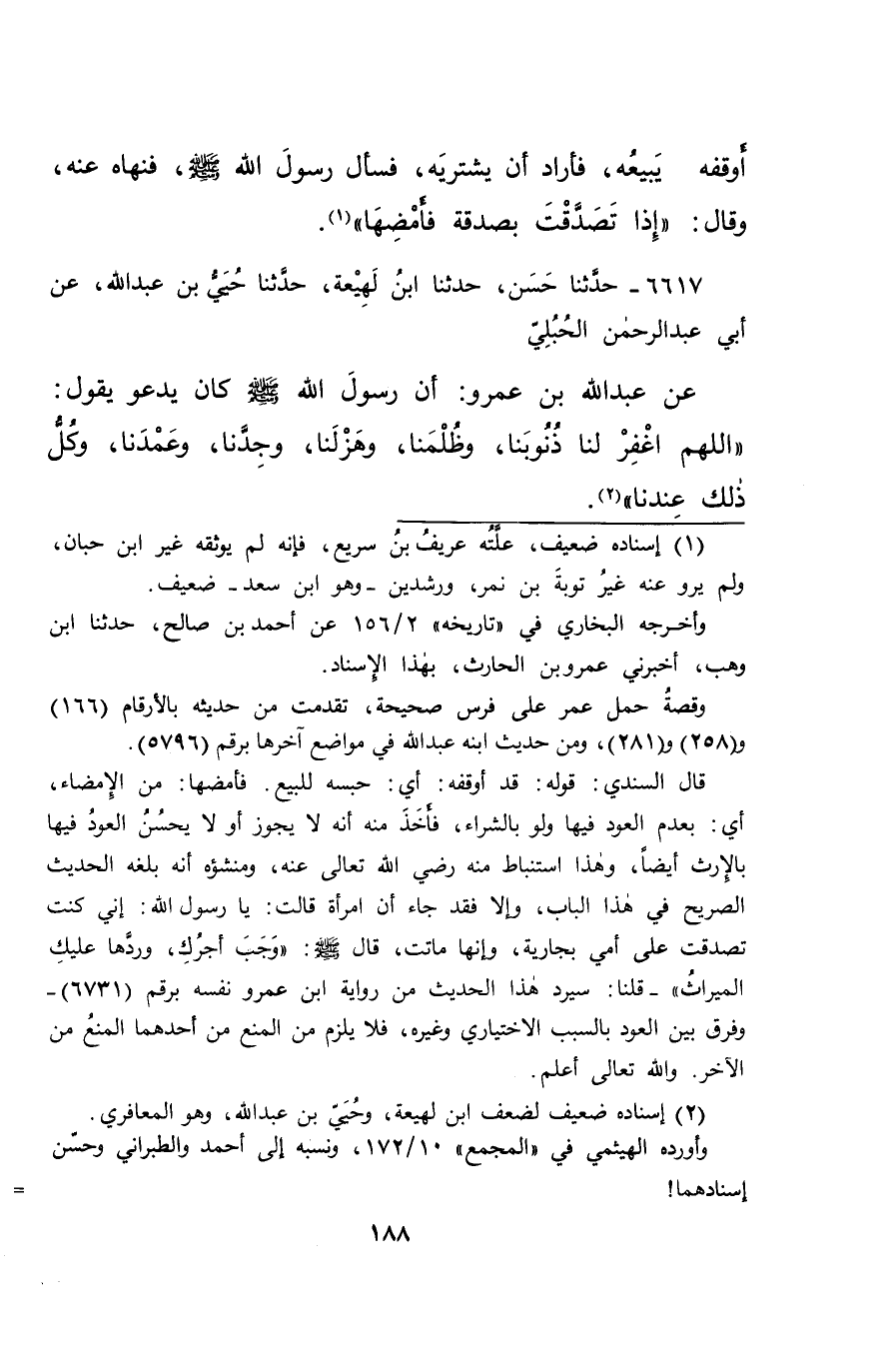 قال السندي: قوله: قد أوقفه: أي: حبسه للبيع. فأمضها: من الإمضاء، أي: بعدم العود فيها ولو بالشراء، فأخذ منه أنه لا يجوز أو لا يحسنُ العود فيها بالإرث أيضاً، وهذا استنباط منه رضي الله تعالى عنه، ومنشفه أنه بلغه الحديث الصريح في هذا الباب، وإلا فقد جاء أن امرأة قالت: يا رسول الله: إني كنت تصدقت على أمي بجارية، وإنها ماتت، قال صَلَّى اللهُ عَلَيْهِ وَسَلَّمَ: "وجب أجرُك، وردها عليك الميراثُ" -قلنا: سيرد هذا الحديث من رواية ابن عمرو نفسه برقم (٦٧٣١) -