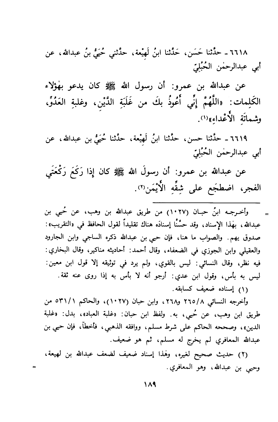٦٦١٩ - حَدَّثَنَا حَسَنٌ، حَدَّثَنَا ابْنُ لَهِيعَةَ، حَدَّثَنَا حُيَيُّ بْنُ عَبْدِ اللهِ، عَنْ أَبِي عَبْدِ الرَّحْمَنِ الْحُبُلِيِّ، عَنْ عَبْدِ اللهِ بْنِ عَمْرٍو: " أَنَّ رَسُولَ اللهِ صَلَّى اللهُ عَلَيْهِ وَسَلَّمَ كَانَ: إِذَا رَكَعَ رَكْعَتَيِ الْفَجْرِ، اضْطَجَعَ عَلَى شِقِّهِ الْأَيْمَنِ " (٢)