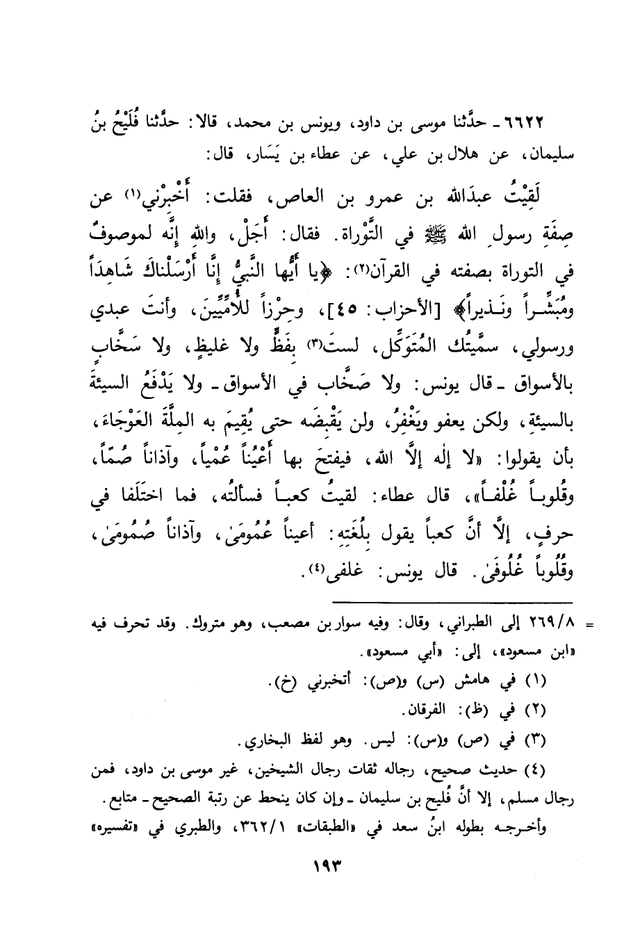 ٦٦٢٢ - حَدَّثَنَا مُوسَى بْنُ دَاوُدَ، وَيُونُسُ بْنُ مُحَمَّدٍ، قَالَا: حَدَّثَنَا فُلَيْحُ بْنُ سُلَيْمَانَ، عَنْ هِلَالِ بْنِ عَلِيٍّ، عَنْ عَطَاءِ بْنِ يَسَارٍ، قَالَ: لَقِيتُ عَبْدَ اللهِ بْنَ عَمْرِو بْنِ الْعَاصِي، فَقُلْتُ: أَخْبِرْنِي (١) عَنْ صِفَةِ رَسُولِ اللهِ صَلَّى اللهُ عَلَيْهِ وَسَلَّمَ فِي التَّوْرَاةِ، فَقَالَ: أَجَلْ، وَاللهِ إِنَّهُ لَمَوْصُوفٌ فِي التَّوْرَاةِ بِصِفَتِهِ فِي الْقُرْآنِ (٢) : {يَا أَيُّهَا النَّبِيُّ إِنَّا أَرْسَلْنَاكَ شَاهِدًا وَمُبَشِّرًا وَنَذِيرًا} [الأحزاب: ٤٥] وَحِرْزًا لِلْأُمِّيِّينَ، وَأَنْتَ عَبْدِي وَرَسُولِي، سَمَّيْتُكَ الْمُتَوَكِّلَ، لَسْتَ (٣) بِفَظٍّ وَلَا غَلِيظٍ، وَلَا سَخَّابٍ بِالْأَسْوَاقِ - قَالَ يُونُسُ: وَلَا صَخَّابٍ فِي الْأَسْوَاقِ - وَلَا يَدْفَعُ السَّيِّئَةَ بِالسَّيِّئَةِ وَلَكِنْ يَعْفُو وَيَغْفِرُ، وَلَنْ يَقْبِضَهُ حَتَّى يُقِيمَ بِهِ الْمِلَّةَ الْعَوْجَاءَ، بِأَنْ يَقُولُوا: " لَا إِلَهَ إِلَّا اللهُ، فَيَفْتَحَ بِهَا أَعْيُنًا عُمْيًا، وَآذَانًا صُمًّا، وَقُلُوبًا غُلْفًا " قَالَ عَطَاءٌ: لَقِيتُ كَعْبًا فَسَأَلْتُهُ، فَمَا اخْتَلَفَا فِي حَرْفٍ، إِلَّا أَنَّ كَعْبًا يَقُولُ بِلُغَتِهِ: أَعْيُنًا عُمُومَى، وَآذَانًا صُمُومَى، وَقُلُوبًا غُلُوفَى - قَالَ يُونُسُ: غُلْفَى (٤)