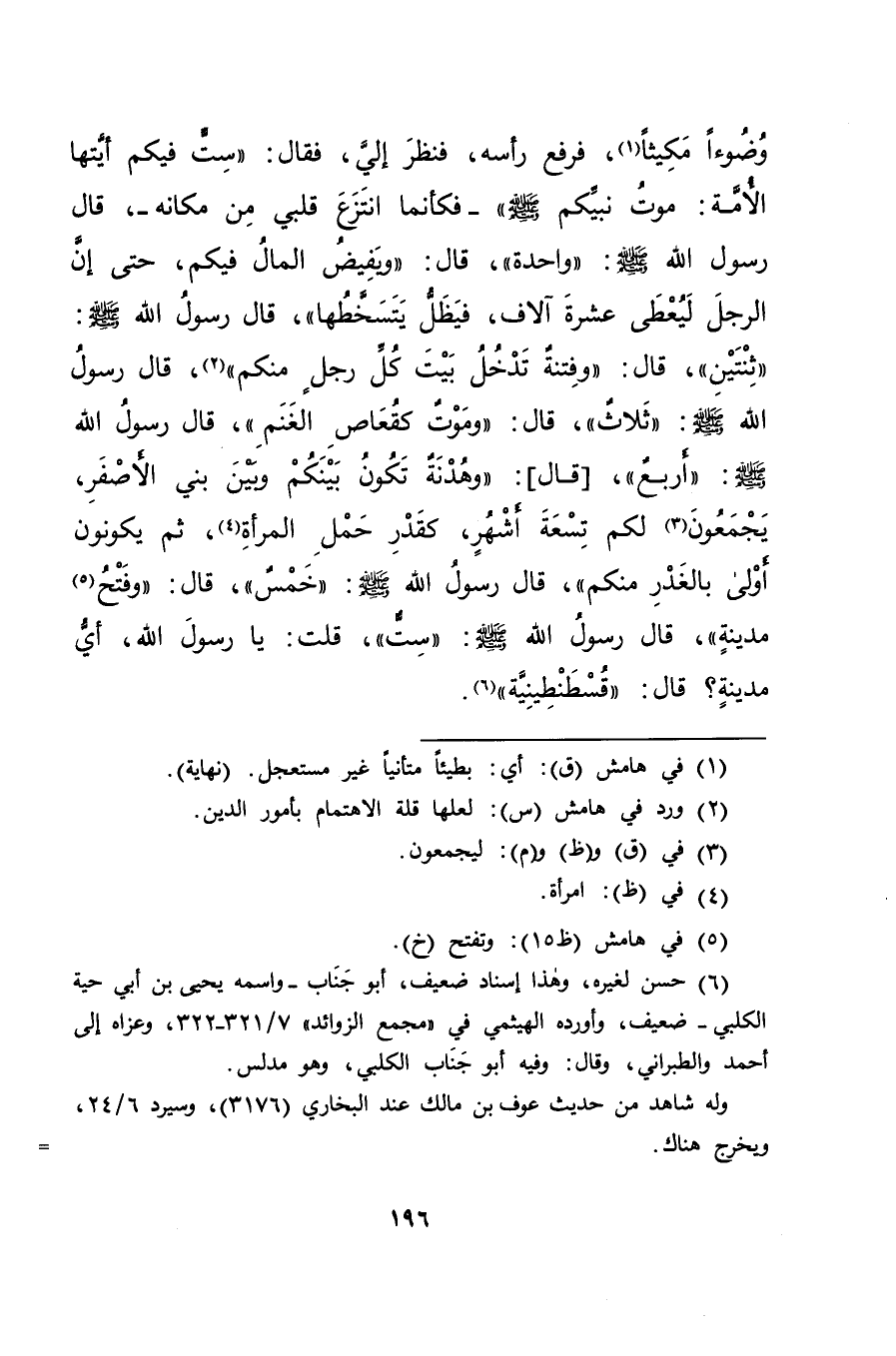 وُضُوءًا مَكِيثًا (١) ، فَرَفَعَ رَأْسَهُ، فَنَظَرَ إِلَيَّ، فَقَالَ: " سِتٌّ فِيكُمْ أَيَّتُهَا الْأُمَّةُ: مَوْتُ نَبِيِّكُمْ " صَلَّى اللهُ عَلَيْهِ وَسَلَّمَ - فَكَأَنَّمَا انْتَزَعَ قَلْبِي مِنْ مَكَانِهِ - قَالَ رَسُولُ اللهِ صَلَّى اللهُ عَلَيْهِ وَسَلَّمَ: " وَاحِدَةٌ " قَالَ: " وَيَفِيضُ الْمَالُ فِيكُمْ، حَتَّى إِنَّ الرَّجُلَ لَيُعْطَى عَشَرَةَ آلَافٍ، فَيَظَلُّ يَتَسَخَّطُهَا "، قَالَ رَسُولُ اللهِ صَلَّى اللهُ عَلَيْهِ وَسَلَّمَ: " ثِنْتَيْنِ "، قَالَ: " وَفِتْنَةٌ تَدْخُلُ بَيْتَ كُلِّ رَجُلٍ مِنْكُمْ " (٢) ، قَالَ رَسُولُ اللهِ صَلَّى اللهُ عَلَيْهِ وَسَلَّمَ: " ثَلَاثٌ "، قَالَ: " وَمَوْتٌ كَقُعَاصِ الْغَنَمِ "، قَالَ رَسُولُ اللهِ صَلَّى اللهُ عَلَيْهِ وَسَلَّمَ: " أَرْبَعٌ [قَالَ] : وَهُدْنَةٌ تَكُونُ بَيْنَكُمْ وَبَيْنَ بَنِي الْأَصْفَرِ يَجْمَعُونَ (٣) لَكُمْ تِسْعَةَ أَشْهُرٍ، كَقَدْرِ حَمْلِ الْمَرْأَةِ (٤) ، ثُمَّ يَكُونُونَ أَوْلَى بِالْغَدْرِ مِنْكُمْ "، قَالَ رَسُولُ اللهِ صَلَّى اللهُ عَلَيْهِ وَسَلَّمَ: " خَمْسٌ "، قَالَ: " وَفَتْحُ (٥) مَدِينَةٍ " قَالَ رَسُولُ اللهِ صَلَّى اللهُ عَلَيْهِ وَسَلَّمَ: " سِتٌّ "، قُلْتُ يَا رَسُولَ اللهِ أَيُّ مَدِينَةٍ؟ قَالَ: " قَسْطَنْطِينِيَّةُ " (٦)