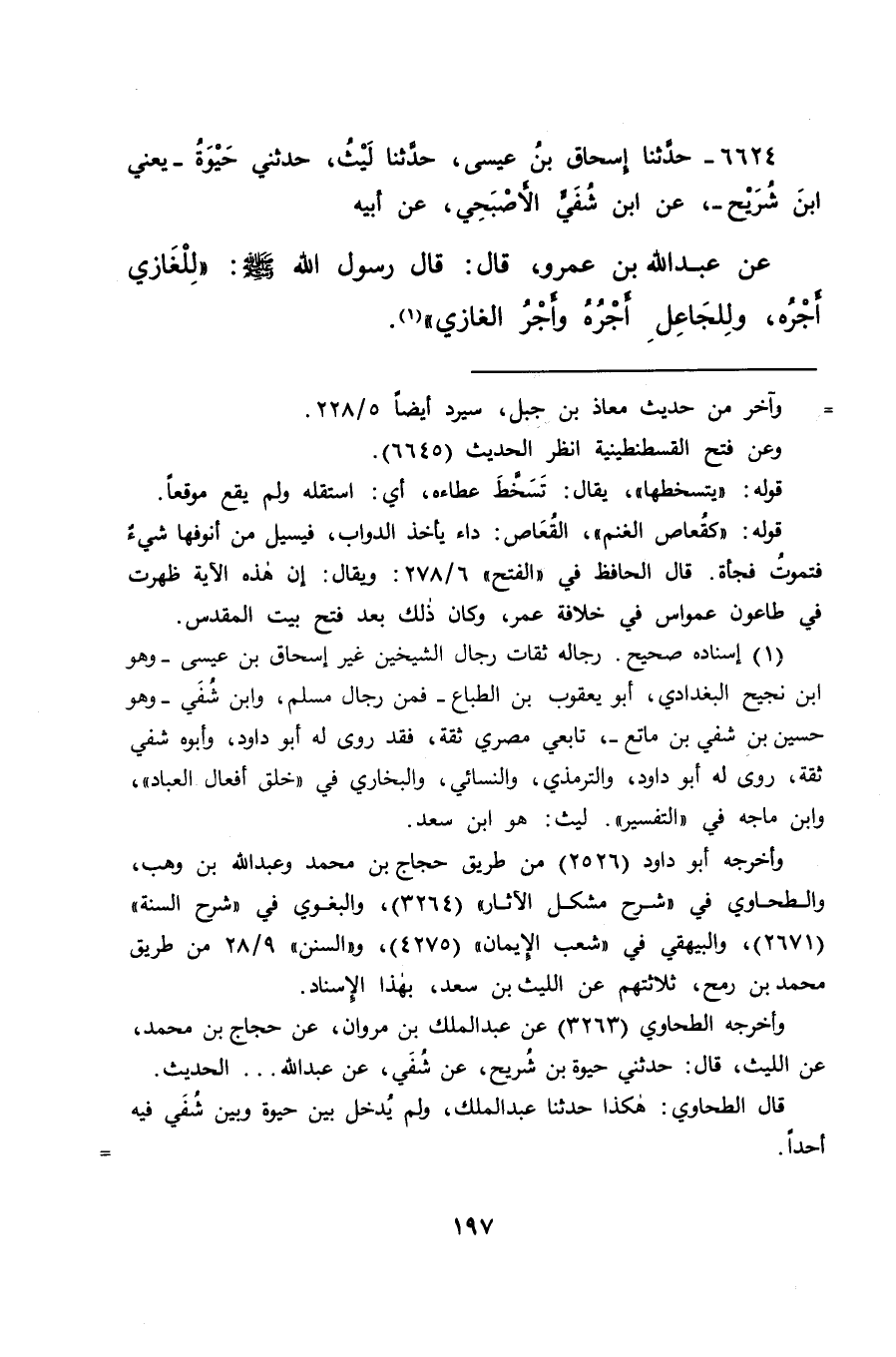 ٦٦٢٤ - حَدَّثَنَا إِسْحَاقُ بْنُ عِيسَى، حَدَّثَنَا لَيْثٌ، حَدَّثَنِي حَيْوَةُ يَعْنِي ابْنَ شُرَيْحٍ، عَنِ ابْنِ شُفَيٍّ الْأَصْبَحِيِّ، عَنْ أَبِيهِ، عَنْ عَبْدِ اللهِ بْنِ عَمْرٍو، قَالَ: قَالَ رَسُولُ اللهِ صَلَّى اللهُ عَلَيْهِ وَسَلَّمَ: " لِلْغَازِي أَجْرُهُ، وَلِلْجَاعِلِ أَجْرُهُ وَأَجْرُ الْغَازِي " (١)