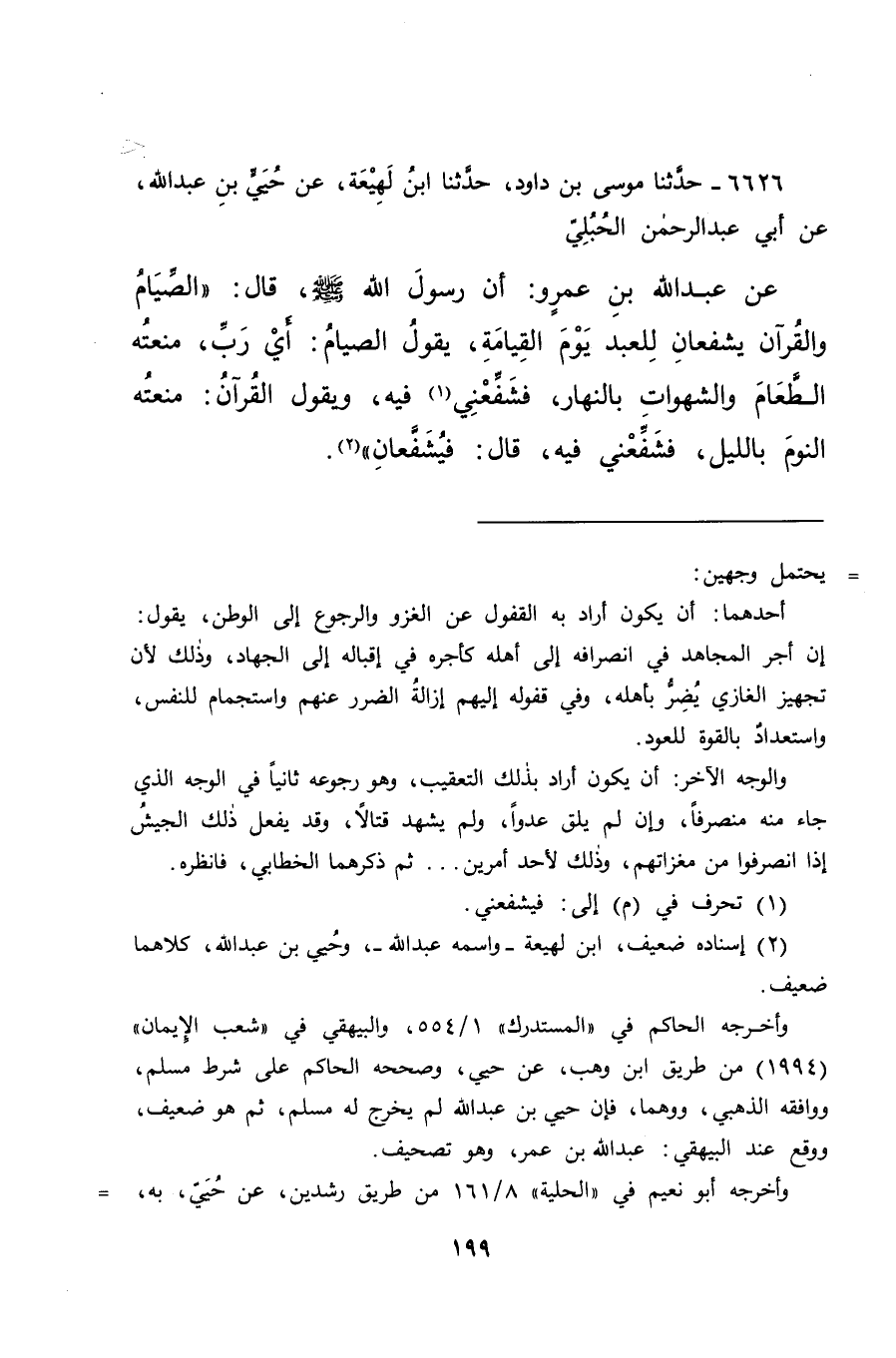 ٦٦٢٦ - حَدَّثَنَا مُوسَى بْنُ دَاوُدَ، حَدَّثَنَا ابْنُ لَهِيعَةَ، عَنْ حُيَيِّ بْنِ عَبْدِ اللهِ، عَنْ أَبِي عَبْدِ الرَّحْمَنِ الْحُبُلِيِّ، عَنْ عَبْدِ اللهِ بْنِ عَمْرٍو: أَنَّ رَسُولَ اللهِ صَلَّى اللهُ عَلَيْهِ وَسَلَّمَ قَالَ: " الصِّيَامُ وَالْقُرْآنُ يَشْفَعَانِ لِلْعَبْدِ يَوْمَ الْقِيَامَةِ، يَقُولُ الصِّيَامُ: أَيْ رَبِّ، مَنَعْتُهُ الطَّعَامَ وَالشَّهَوَاتِ بِالنَّهَارِ، فَشَفِّعْنِي (١) فِيهِ، وَيَقُولُ الْقُرْآنُ: مَنَعْتُهُ النَّوْمَ بِاللَّيْلِ، فَشَفِّعْنِي فِيهِ "، قَالَ: " فَيُشَفَّعَانِ " (٢)