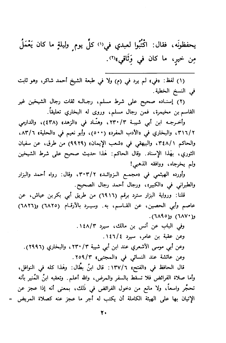 يَحْفَظُونَهُ فَقَالَ: اكْتُبُوا لِعَبْدِي فِي (١) كُلِّ يَوْمٍ وَلَيْلَةٍ، مَا كَانَ يَعْمَلُ مِنْ خَيْرٍ، مَا كَانَ فِي وِثَاقِي " (٢)