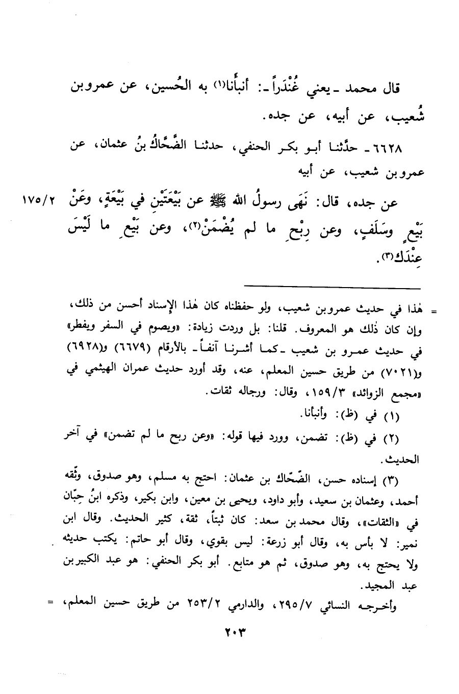 ٦٦٢٨ - حَدَّثَنَا أَبُو بَكْرٍ الْحَنَفِيُّ، حَدَّثَنَا الضَّحَّاكُ بْنُ عُثْمَانَ، عَنْ عَمْرِو بْنِ شُعَيْبٍ، عَنْ أَبِيهِ، عَنْ جَدِّهِ قَالَ: " نَهَى رَسُولُ اللهِ صَلَّى اللهُ عَلَيْهِ وَسَلَّمَ عَنْ بَيْعَتَيْنِ فِي بَيْعَةٍ، وَعَنْ بَيْعٍ وَسَلَفٍ، وَعَنْ رِبْحِ مَا لَمْ يُضْمَنْ (٢) ، وَعَنْ بَيْعِ مَا لَيْسَ عِنْدَكَ " (٣)