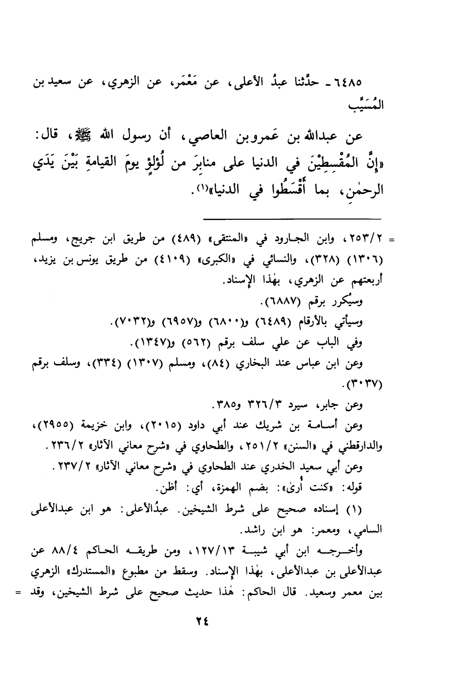 ٦٤٨٥ - حَدَّثَنَا عَبْدُ الْأَعْلَى، عَنْ مَعْمَرٍ، عَنِ الزُّهْرِيِّ، عَنْ سَعِيدِ بْنِ الْمُسَيِّبِ، عَنْ عَبْدِ اللهِ بْنِ عَمْرِو بْنِ الْعَاصِ، أَنَّ رَسُولَ اللهِ صَلَّى اللهُ عَلَيْهِ وَسَلَّمَ قَالَ: " إِنَّ الْمُقْسِطِينَ فِي الدُّنْيَا عَلَى مَنَابِرَ مِنْ لُؤْلُؤٍ يَوْمَ الْقِيَامَةِ بَيْنَ يَدَيِ الرَّحْمَنِ، بِمَا أَقْسَطُوا فِي الدُّنْيَا " (١)