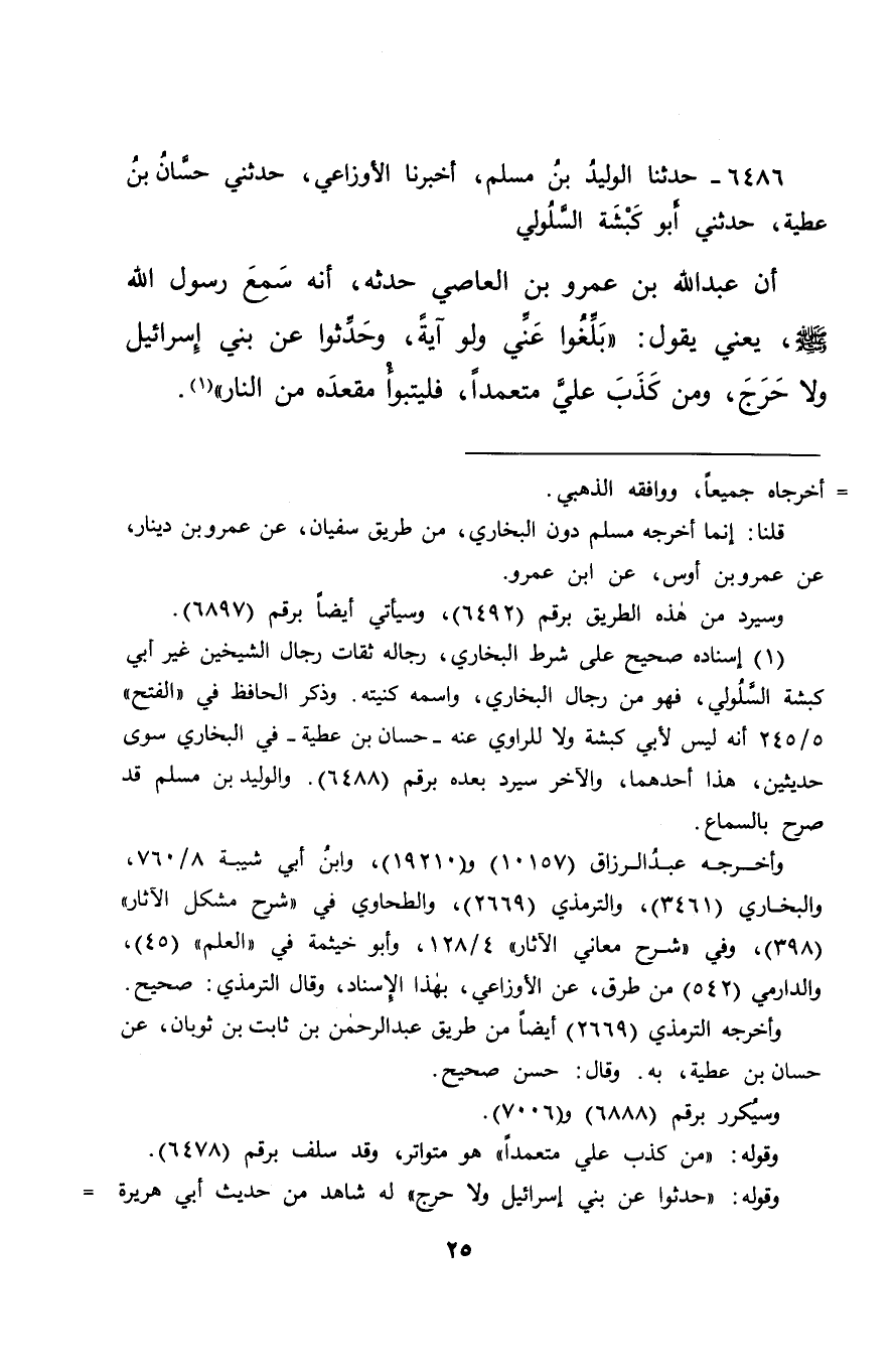 ٦٤٨٦ - حَدَّثَنَا الْوَلِيدُ بْنُ مُسْلِمٍ، أَخْبَرَنَا الْأَوْزَاعِيُّ، حَدَّثَنِي حَسَّانُ بْنُ عَطِيَّةَ، حَدَّثَنِي أَبُو كَبْشَةَ السَّلُولِيُّ، أَنَّ عَبْدَ اللهِ بْنَ عَمْرِو بْنِ الْعَاصِ، حَدَّثَهُ أَنَّهُ سَمِعَ رَسُولَ اللهِ صَلَّى اللهُ عَلَيْهِ وَسَلَّمَ يَعْنِي يَقُولُ: " بَلِّغُوا عَنِّي وَلَوْ آيَةً، وَحَدِّثُوا عَنْ بَنِي إِسْرَائِيلَ وَلَا حَرَجَ، وَمَنْ كَذَبَ عَلَيَّ مُتَعَمِّدًا، فَلْيَتَبَوَّأْ مَقْعَدَهُ مِنَ النَّارِ " (١)