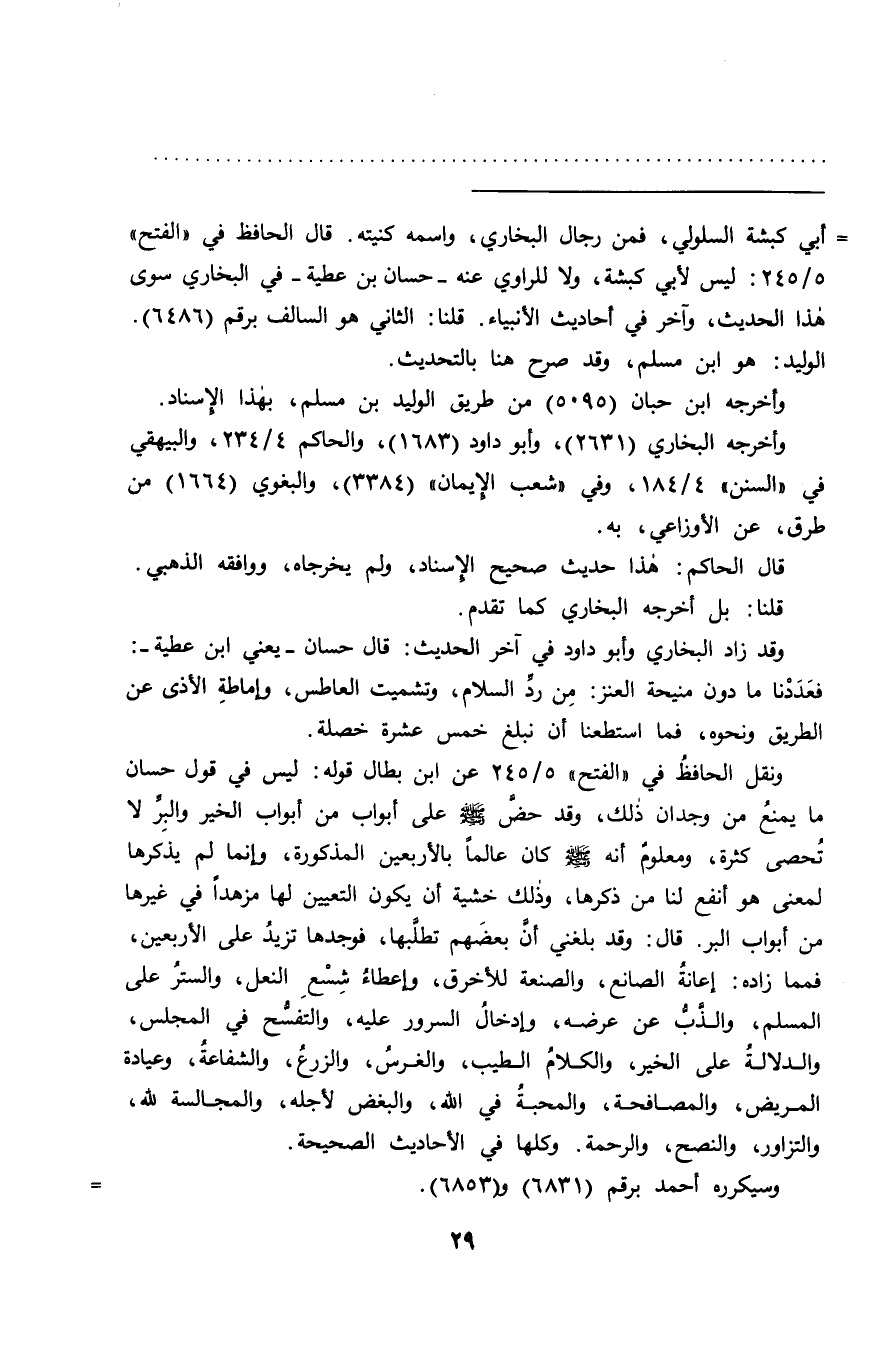ونقل الحافظُ في "الفتح" ٥/٢٤٥ عن ابن بطال قوله: ليس في قول حسان ما يمنعُ من وجدان ذلك، وقد حض صَلَّى اللهُ عَلَيْهِ وَسَلَّمَ على أبواب من أبواب الخير والبر لا تُحصى كثرة، ومعلوم أنه صَلَّى اللهُ عَلَيْهِ وَسَلَّمَ كان عالماً بالأربعين المذكورة، وإنما لم يذكرها لمعنى هو أنفع لنا من ذكرها، وذلك خشية أن يكون التعيين لها مزهداً في غيرها من أبواب البر. قال: وقد بلغني أن بعضهم تطلبها، فوجدها تزيدُ على الأربعين، فمما زاده: إعانة الصانع، والصنعة للأخرق، وإعطاء شِسْعِ النعل، والستر على المسلم، والذب عن عرضه، وإدخالُ السرور عليه، والتفسح في المجلس،