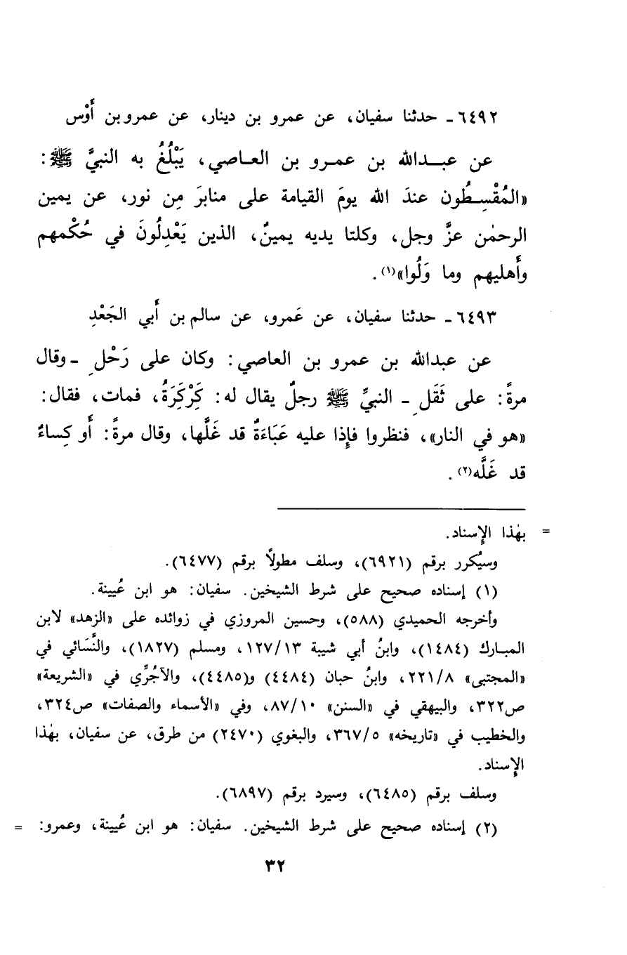 ٦٤٩٢ - حَدَّثَنَا سُفْيَانُ، عَنْ عَمْرِو بْنِ دِينَارٍ، عَنْ عَمْرِو بْنِ أَوْسٍ، عَنْ عَبْدِ اللهِ بْنِ عَمْرِو بْنِ الْعَاصِ، يَبْلُغُ بِهِ النَّبِيَّ صَلَّى اللهُ عَلَيْهِ وَسَلَّمَ " الْمُقْسِطُونَ عِنْدَ اللهِ يَوْمَ الْقِيَامَةِ عَلَى مَنَابِرَ مِنْ نُورٍ، عَنْ يَمِينِ الرَّحْمَنِ عَزَّ وَجَلَّ، وَكِلْتَا يَدَيْهِ يَمِينٌ، الَّذِينَ يَعْدِلُونَ فِي حُكْمِهِمْ، وَأَهْلِيهِمْ وَمَا وَلُوا " (١)