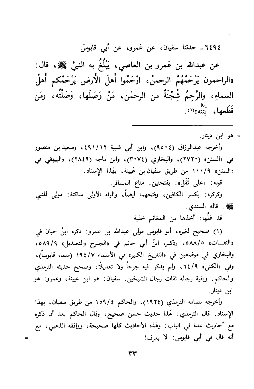 ٦٤٩٤ - حَدَّثَنَا سُفْيَانُ، عَنْ عَمْرٍو، عَنْ أَبِي قَابُوسَ، عَنْ عَبْدِ اللهِ بْنِ عَمْرِو بْنِ الْعَاصِ، يَبْلُغُ بِهِ النَّبِيَّ صَلَّى اللهُ عَلَيْهِ وَسَلَّمَ قَالَ: " الرَّاحِمُونَ يَرْحَمُهُمُ الرَّحْمَنُ، ارْحَمُوا أَهْلَ الْأَرْضِ يَرْحَمْكُمْ أَهْلُ السَّمَاءِ، وَالرَّحِمُ شُجْنَةٌ مِنَ الرَّحْمَنِ، مَنْ وَصَلَهَا، وَصَلَتْهُ، وَمَنْ قَطَعَهَا، بَتَّتْهُ " (١)