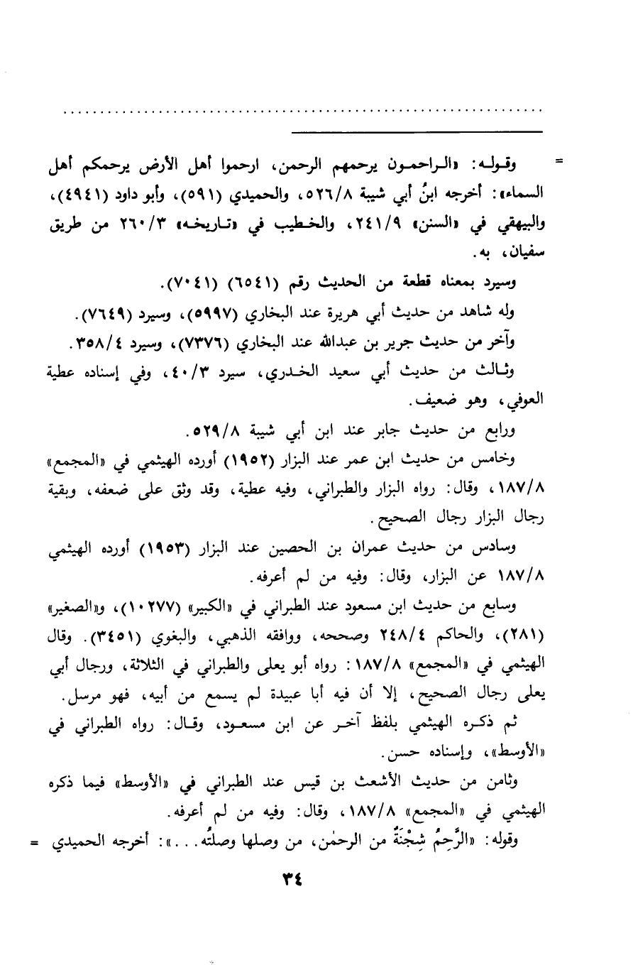 =وقوله: "الراحمون يرحمهم الرحمن، ارحموا أهل الأرض يرحمكم أهل السماء": أخرجه ابنُ أبي شيبة ٨/٥٢٦، والحميدي (٥٩١) ، وأبو داود (٤٩٤١) ، والبيهقي في "السنن" ٩/٢٤١، والخطيب في "تاريخه" ٣/٢٦٠ من طريق سفيان، به.