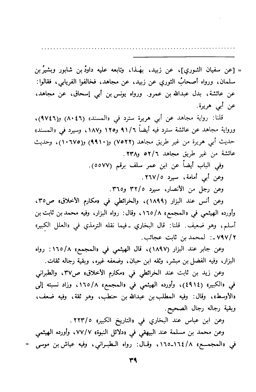 = [عن سفيان الثوري] ، عن زبيد، بهذا، وتابعه عليه داودُ بن شابور وبشيرُ بن سلمان، ورواه أصحابُ الثوري عن زبيد، عن مجاهد، فخالفوا الفريابي، فقالوا: عن عائشة، بدل عبد الله بن عمرو. ورواه يونس بن أبي إسحاق، عن مجاهد، عن أبي هريرة.