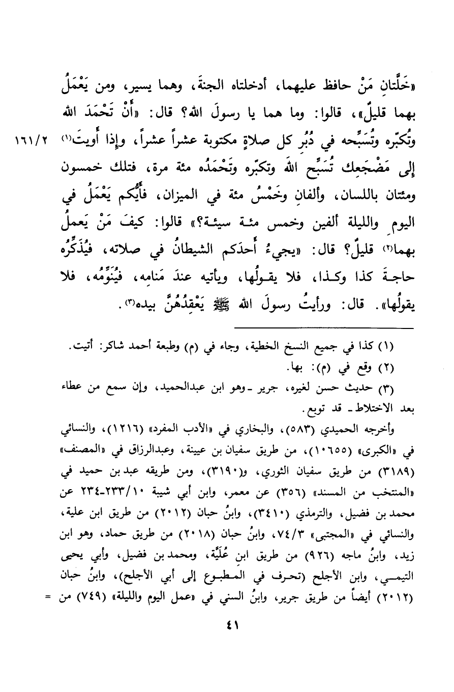 "خَلَّتَانِ مَنْ حَافَظَ عَلَيْهِمَا، أَدْخَلَتَاهُ الْجَنَّةَ، وَهُمَا يَسِيرٌ، وَمَنْ يَعْمَلُ بِهِمَا قَلِيلٌ " قَالُوا: وَمَا هُمَا يَا رَسُولَ اللهِ؟ قَالَ: " أَنْ تَحْمَدَ اللهَ وَتُكَبِّرَهُ وَتُسَبِّحَهُ فِي دُبُرِ كُلِّ صَلَاةٍ مَكْتُوبَةٍ عَشْرًا، عَشْرًا، وَإِذَا أَوَيْتَ (١) إِلَى مَضْجَعِكَ تُسَبِّحُ اللهَ وَتُكَبِّرُهُ وَتَحْمَدُهُ مِائَةَ مَرَّةٍ، فَتِلْكَ خَمْسُونَ وَمِائَتَانِ بِاللِّسَانِ، وَأَلْفَانِ وَخَمْسُ مِائَةٍ فِي الْمِيزَانِ، فَأَيُّكُمْ يَعْمَلُ فِي الْيَوْمِ وَاللَّيْلَةِ أَلْفَيْنِ، وَخَمْسَ مِائَةِ سَيِّئَةٍ؟ " قَالُوا: كَيْفَ مَنْ يَعْمَلُ بِهِمَا (٢) قَلِيلٌ؟ قَالَ: " يَجِيءُ أَحَدَكُمُ الشَّيْطَانُ فِي صَلَاتِهِ، فَيُذَكِّرُهُ حَاجَةَ كَذَا وَكَذَا، فَلَا يَقُولُهَا، وَيَأْتِيهِ عِنْدَ مَنَامِهِ، فَيُنَوِّمُهُ، فَلَا يَقُولُهَا " قَالَ: وَرَأَيْتُ رَسُولَ اللهِ صَلَّى اللهُ عَلَيْهِ وَسَلَّمَ يَعْقِدُهُنَّ بِيَدِهِ (٣)