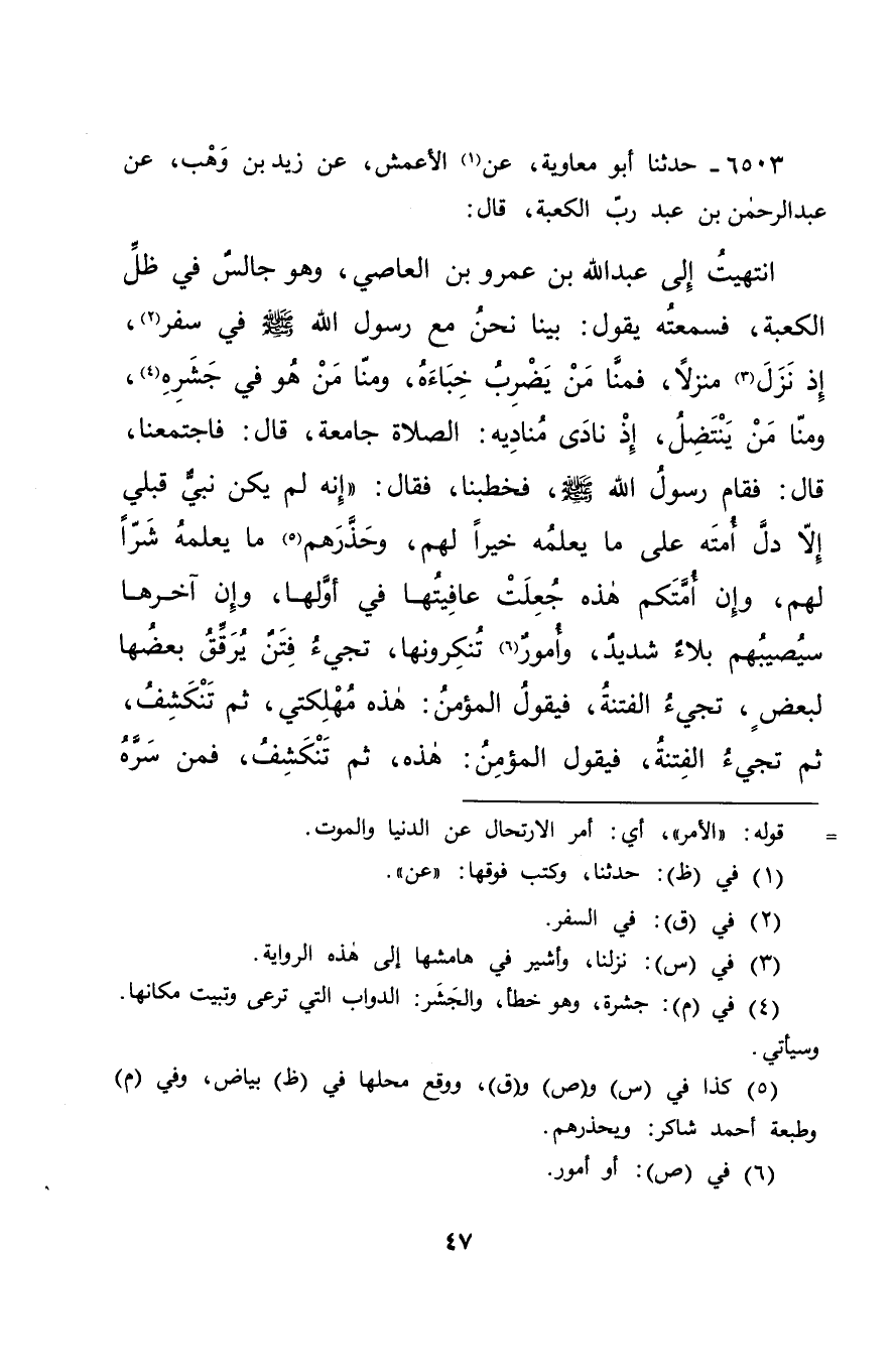 ٦٥٠٣ - حَدَّثَنَا أَبُو مُعَاوِيَةَ، عَنِ (١) الْأَعْمَشِ، عَنْ زَيْدِ بْنِ وَهْبٍ، عَنْ عَبْدِ الرَّحْمَنِ بْنِ عَبْدِ رَبِّ الْكَعْبَةِ، قَالَ: انْتَهَيْتُ إِلَى عَبْدِ اللهِ بْنِ عَمْرِو بْنِ الْعَاصِ، وَهُوَ جَالِسٌ فِي ظِلِّ الْكَعْبَةِ، فَسَمِعْتُهُ يَقُولُ: بَيْنَا نَحْنُ مَعَ رَسُولِ اللهِ صَلَّى اللهُ عَلَيْهِ وَسَلَّمَ فِي سَفَرٍ (٢) ، إِذْ نَزَلَ (٣) مَنْزِلًا، فَمِنَّا مَنْ يَضْرِبُ خِبَاءَهُ، وَمِنَّا مَنْ هُوَ فِي جَشَرِهِ (٤) ، وَمِنَّا مَنْ يَنْتَضِلُ، إِذْ نَادَى مُنَادِيهِ: الصَّلَاةُ جَامِعَةٌ، قَالَ: فَاجْتَمَعْنَا، قَالَ: فَقَامَ رَسُولُ اللهِ صَلَّى اللهُ عَلَيْهِ وَسَلَّمَ، فَخَطَبَنَا، فَقَالَ: " إِنَّهُ لَمْ يَكُنْ نَبِيٌّ قَبْلِي إِلَّا دَلَّ أُمَّتَهُ عَلَى مَا يَعْلَمُهُ خَيْرًا لَهُمْ، وَحَذَّرَهُمْ (٥) مَا يَعْلَمُهُ شَرًّا لَهُمْ، وَإِنَّ أُمَّتَكُمْ هَذِهِ جُعِلَتْ عَافِيَتُهَا فِي أَوَّلِهَا، وَإِنَّ آخِرَهَا سَيُصِيبُهُمْ بَلَاءٌ شَدِيدٌ، وَأُمُورٌ (٦) تُنْكِرُونَهَا، تَجِيءُ فِتَنٌ يُرَقِّقُ بَعْضُهَا لِبَعْضٍ، تَجِيءُ الْفِتْنَةُ، فَيَقُولُ الْمُؤْمِنُ: هَذِهِ مُهْلِكَتِي، ثُمَّ تَنْكَشِفُ، ثُمَّ تَجِيءُ الْفِتْنَةُ، فَيَقُولُ الْمُؤْمِنُ: هَذِهِ، ثُمَّ تَنْكَشِفُ، فَمَنْ سَرَّهُ