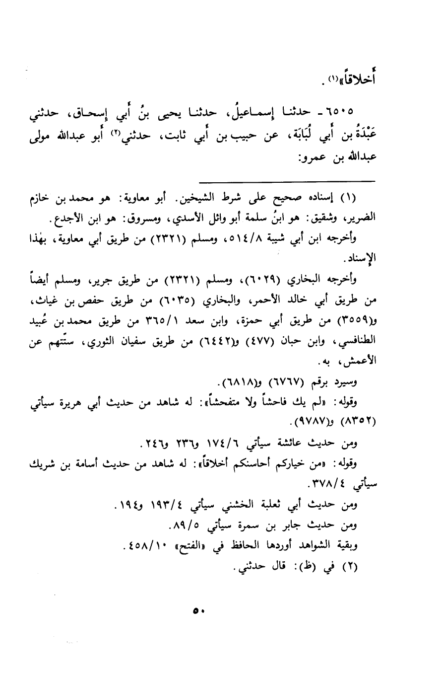 ٦٥٠٥ - حَدَّثَنَا إِسْمَاعِيلُ، حَدَّثَنَا يَحْيَى بْنُ أَبِي إِسْحَاقَ، حَدَّثَنِي عَبْدَةُ بْنُ أَبِي لُبَابَةَ، عَنْ حَبِيبِ بْنِ أَبِي ثَابِتٍ، حَدَّثَنِي (٢) أَبُو عَبْدِ اللهِ، مَوْلَى عَبْدِ اللهِ بْنِ عَمْرٍو،