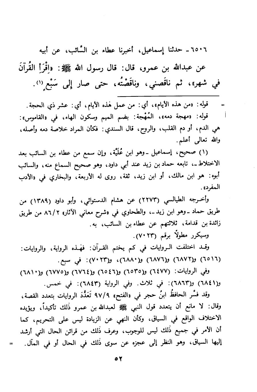 وقد اختلفت الروايات في كم يختم القرآن: فهذه الرواية، والروايات: (٦٥١٦) و (٦٨٧٢) و (٦٨٧٦) و (٦٨٨٠) ، و (٧٠٢٣) : في سبع.