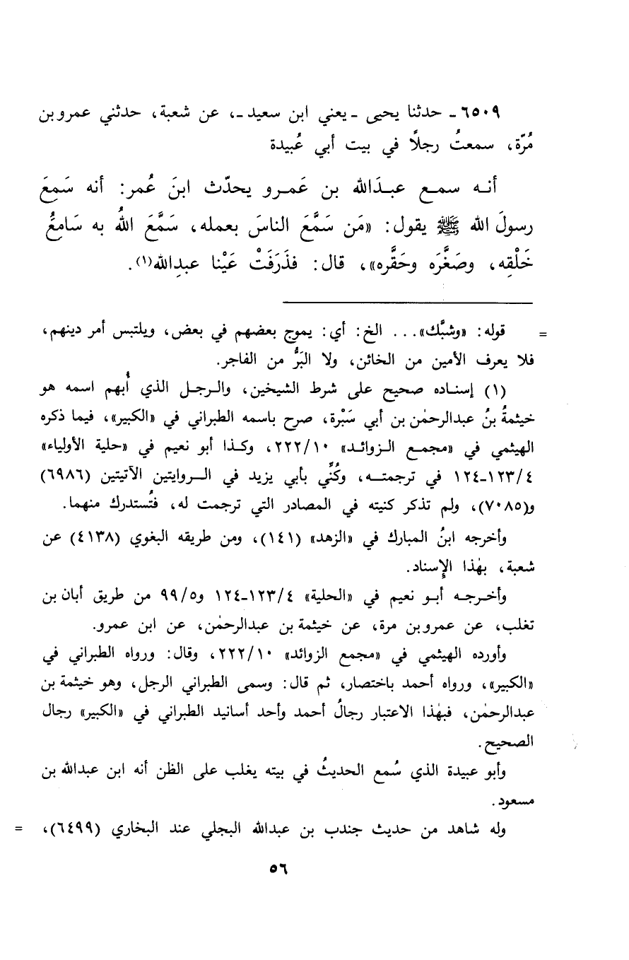 ٦٥٠٩ - حَدَّثَنَا يَحْيَى يَعْنِي ابْنَ سَعِيدٍ، عَنْ شُعْبَةَ، حَدَّثَنِي عَمْرُو بْنُ مُرَّةَ، سَمِعْتُ رَجُلًا، فِي بَيْتِ أَبِي عُبَيْدَةَ، أَنَّهُ سَمِعَ عَبْدَ اللهِ بْنَ عَمْرٍو، يُحَدِّثُ ابْنَ عُمَرَ: أَنَّهُ سَمِعَ رَسُولَ اللهِ صَلَّى اللهُ عَلَيْهِ وَسَلَّمَ يَقُولُ: " مَنْ سَمَّعَ النَّاسَ بِعَمَلِهِ، سَمَّعَ اللهُ بِهِ سَامِعَ خَلْقِهِ، وَصَغَّرَهُ وَحَقَّرَهُ "، قَالَ: فَذَرَفَتْ عَيْنَا عَبْدِ اللهِ (١)