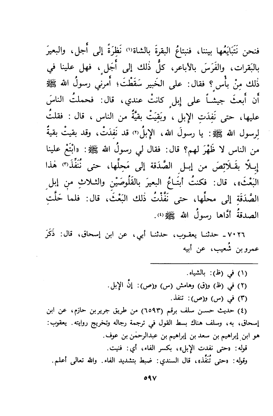 فَنَحْنُ نَتَبَايَعُهَا بَيْنَنَا، فَنَبْتَاعُ الْبَقَرَةَ بِالشَّاةِ (١) نَظِرَةً إِلَى أَجَلٍ، وَالْبَعِيرَ بِالْبَقَرَاتِ، وَالْفَرَسَ بِالْأَبَاعِرِ، كُلُّ ذَلِكَ إِلَى أَجَلٍ، فَهَلْ عَلَيْنَا فِي ذَلِكَ مِنْ بَأْسٍ؟ فَقَالَ: عَلَى الْخَبِيرِ سَقَطْتَ، أَمَرَنِي رَسُولُ اللهِ صَلَّى اللهُ عَلَيْهِ وَسَلَّمَ أَنْ أَبْعَثَ جَيْشًا عَلَى إِبِلٍ كَانَتْ عِنْدِي، قَالَ: فَحَمَلْتُ النَّاسَ عَلَيْهَا، حَتَّى نَفِدَتِ الْإِبِلُ، وَبَقِيَتْ بَقِيَّةٌ مِنَ النَّاسِ، قَالَ: فَقُلْتُ لِرَسُولِ اللهِ صَلَّى اللهُ عَلَيْهِ وَسَلَّمَ: يَا رَسُولَ اللهِ، الْإِبِلُ (٢) قَدْ نَفِدَتْ، وَقَدْ بَقِيَتْ بَقِيَّةٌ مِنَ النَّاسِ لَا ظَهْرَ لَهُمْ؟ قَالَ: فَقَالَ لِي رَسُولُ اللهِ صَلَّى اللهُ عَلَيْهِ وَسَلَّمَ: " ابْتَعْ عَلَيْنَا إِبِلًا بِقَلَائِصَ مِنْ إِبِلِ الصَّدَقَةِ إِلَى مَحِلِّهَا، حَتَّى نُنَفِّذَ (٣) هَذَا الْبَعْثَ "، قَالَ: فَكُنْتُ أَبْتَاعُ الْبَعِيرَ بِالْقَلُوصَيْنِ وَالثَّلَاثِ مِنْ إِبِلِ الصَّدَقَةِ إِلَى مَحِلِّهَا، حَتَّى نَفَّذْتُ ذَلِكَ الْبَعْثَ، قَالَ: فَلَمَّا حَلَّتِ الصَّدَقَةُ أَدَّاهَا رَسُولُ اللهِ صَلَّى اللهُ عَلَيْهِ وَسَلَّمَ (٤)
