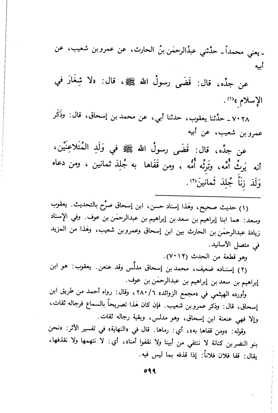 ٧٠٢٨ - حَدَّثَنَا يَعْقُوبُ، حَدَّثَنَا أَبِي، عَنْ مُحَمَّدِ بْنِ إِسْحَاقَ، قَالَ: وَذَكَرَ عَمْرُو بْنُ شُعَيْبٍ، عَنْ أَبِيهِ، عَنْ جَدِّهِ، قَالَ: " قَضَى رَسُولُ اللهِ صَلَّى اللهُ عَلَيْهِ وَسَلَّمَ فِي وَلَدِ الْمُتَلَاعِنَيْنِ، أَنَّهُ يَرِثُ أُمَّهُ، وَتَرِثُهُ أُمُّهُ، وَمَنْ قَفَاهَا بِهِ جُلِدَ ثَمَانِينَ، وَمَنْ دَعَاهُ وَلَدَ زِنًا جُلِدَ ثَمَانِينَ " (٢)