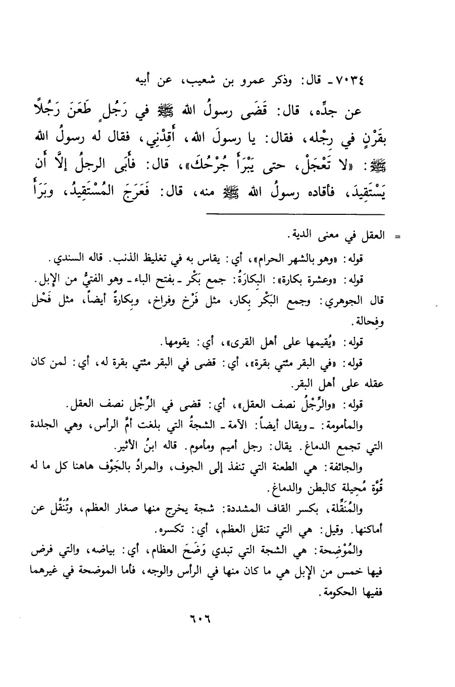 ٧٠٣٤ - قَالَ: وَذَكَرَ عَمْرُو بْنُ شُعَيْبٍ، عَنْ أَبِيهِ، عَنْ جَدِّهِ، قَالَ: قَضَى رَسُولُ اللهِ صَلَّى اللهُ عَلَيْهِ وَسَلَّمَ فِي رَجُلٍ طَعَنَ رَجُلًا بِقَرْنٍ فِي رِجْلِهِ، فَقَالَ: يَا رَسُولَ اللهِ، أَقِدْنِي، فَقَالَ لَهُ رَسُولُ اللهِ صَلَّى اللهُ عَلَيْهِ وَسَلَّمَ: " لَا تَعْجَلْ حَتَّى يَبْرَأَ جُرْحُكَ "، قَالَ: فَأَبَى الرَّجُلُ إِلَّا أَنْ يَسْتَقِيدَ، فَأَقَادَهُ رَسُولُ اللهِ صَلَّى اللهُ عَلَيْهِ وَسَلَّمَ مِنْهُ، قَالَ: فَعَرِجَ الْمُسْتَقِيدُ، وَبَرَأَ