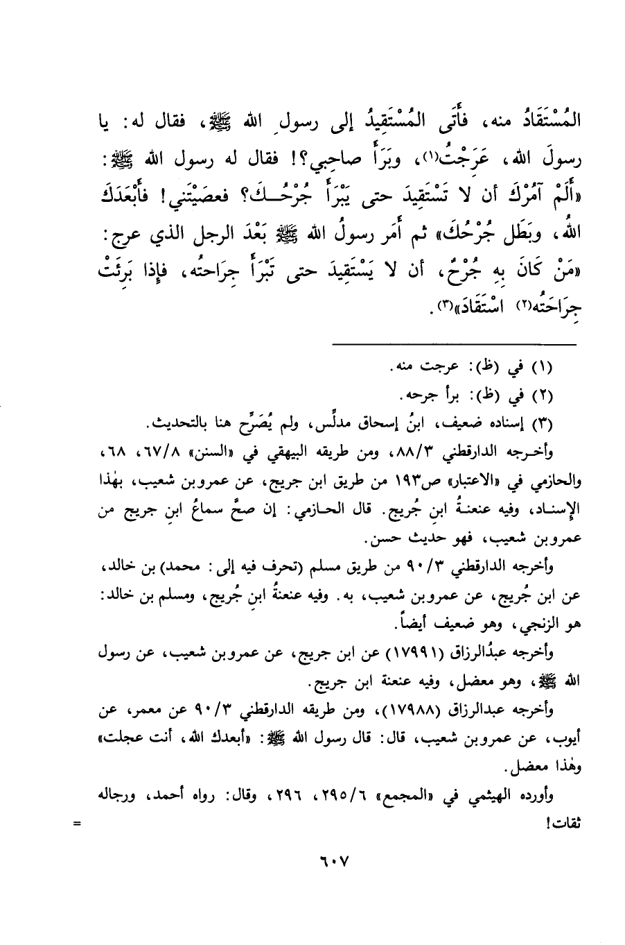 الْمُسْتَقَادُ مِنْهُ، فَأَتَى الْمُسْتَقِيدُ إِلَى رَسُولِ اللهِ صَلَّى اللهُ عَلَيْهِ وَسَلَّمَ، فَقَالَ لَهُ: يَا رَسُولَ اللهِ، عَرِجْتُ (١) ، وَبَرَأَ صَاحِبِي؟ فَقَالَ لَهُ رَسُولُ اللهِ صَلَّى اللهُ عَلَيْهِ وَسَلَّمَ: " أَلَمْ آمُرْكَ أَلَّا تَسْتَقِيدَ، حَتَّى يَبْرَأَ جُرْحُكَ؟ فَعَصَيْتَنِي فَأَبْعَدَكَ اللهُ، وَبَطَلَ جُرْحُكَ " ثُمَّ أَمَرَ رَسُولُ اللهِ صَلَّى اللهُ عَلَيْهِ وَسَلَّمَ بَعْدَ الرَّجُلِ الَّذِي عَرِجَ: " مَنْ كَانَ بِهِ جُرْحٌ، أَنْ لَا يَسْتَقِيدَ، حَتَّى تَبْرَأَ جِرَاحَتُهُ، فَإِذَا بَرِئَتْ جِرَاحَتُهُ (٢) اسْتَقَادَ " (٣)