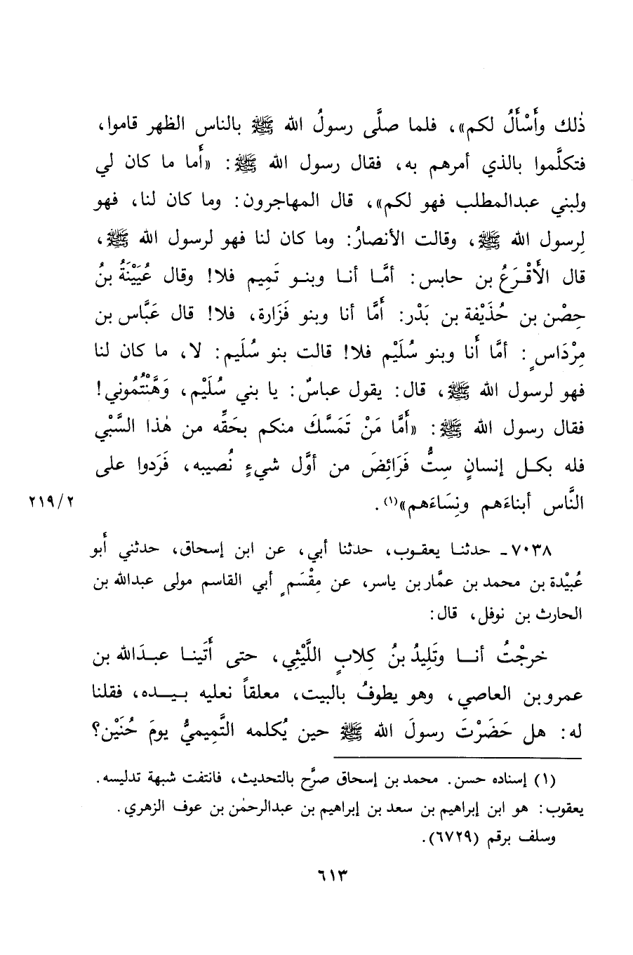 ذَلِكَ وَأَسْأَلُ لَكُمْ "، فَلَمَّا صَلَّى رَسُولُ اللهِ صَلَّى اللهُ عَلَيْهِ وَسَلَّمَ بِالنَّاسِ الظُّهْرَ قَامُوا، فَتَكَلَّمُوا بِالَّذِي أَمَرَهُمْ بِهِ، فَقَالَ رَسُولُ اللهِ صَلَّى اللهُ عَلَيْهِ وَسَلَّمَ: " أَمَّا مَا كَانَ لِي ولِبَنِي عَبْدِ الْمُطَّلِبِ فَهُوَ لَكُمْ "، قَالَ الْمُهَاجِرُونَ: وَمَا كَانَ لَنَا، فَهُوَ لِرَسُولِ اللهِ صَلَّى اللهُ عَلَيْهِ وَسَلَّمَ، وَقَالَتِ الْأَنْصَارُ: وَمَا كَانَ لَنَا فَهُوَ لِرَسُولِ اللهِ صَلَّى اللهُ عَلَيْهِ وَسَلَّمَ، قَالَ الْأَقْرَعُ بْنُ حَابِسٍ: أَمَّا أَنَا وَبَنُو تَمِيمٍ فَلَا وَقَالَ عُيَيْنَةُ بْنُ حِصْنِ بْنِ حُذَيْفَةَ بْنِ بَدْرٍ: أَمَّا أَنَا وَبَنُو فَزَارَةَ، فَلَا قَالَ عَبَّاسُ بْنُ مِرْدَاسٍ: أَمَّا أَنَا وَبَنُو سُلَيْمٍ فَلَا قَالَتْ بَنُو سُلَيْمٍ: لَا، مَا كَانَ لَنَا فَهُوَ لِرَسُولِ اللهِ صَلَّى اللهُ عَلَيْهِ وَسَلَّمَ، قَالَ: يَقُولُ عَبَّاسٌ: يَا بَنِي سُلَيْمٍ، وَهَّنْتُمُونِي فَقَالَ رَسُولُ اللهِ صَلَّى اللهُ عَلَيْهِ وَسَلَّمَ: " أَمَّا مَنْ تَمَسَّكَ مِنْكُمْ بِحَقِّهِ مِنْ هَذَا السَّبْيِ، فَلَهُ بِكُلِّ إِنْسَانٍ سِتُّ فَرَائِضَ مِنْ أَوَّلِ شَيْءٍ نُصِيبُهُ، فَرَدُّوا عَلَى النَّاسِ أَبْنَاءَهُمْ وَنِسَاءَهُمْ " (١)
