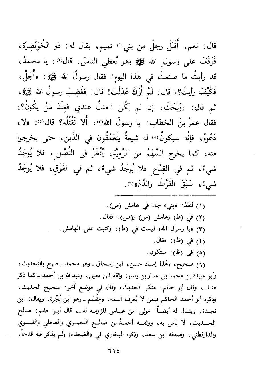 قَالَ: نَعَمْ، أَقْبَلَ رَجُلٌ مِنْ بَنِي (١) تَمِيمٍ، يُقَالُ لَهُ: ذُو الْخُوَيْصِرَةِ، فَوَقَفَ عَلَى رَسُولِ اللهِ صَلَّى اللهُ عَلَيْهِ وَسَلَّمَ، وَهُوَ يُعْطِي النَّاسَ، قَالَ (٢) : يَا مُحَمَّدُ، قَدْ رَأَيْتَ مَا صَنَعْتَ فِي هَذَا الْيَوْمِ فَقَالَ رَسُولُ اللهِ صَلَّى اللهُ عَلَيْهِ وَسَلَّمَ: " أَجَلْ، فَكَيْفَ رَأَيْتَ؟ " قَالَ: لَمْ أَرَكَ عَدَلْتَ قَالَ: فَغَضِبَ رَسُولُ اللهِ صَلَّى اللهُ عَلَيْهِ وَسَلَّمَ، ثُمَّ قَالَ: " وَيْحَكَ، إِنْ لَمْ يَكُنِ الْعَدْلُ عِنْدِي، فَعِنْدَ مَنْ يَكُونُ؟ "، فَقَالَ عُمَرُ بْنُ الْخَطَّابِ: يَا رَسُولَ اللهِ (٣) ، أَلَا نَقْتُلُهُ؟ قَالَ (٤) : " لَا، دَعُوهُ، فَإِنَّهُ سَيَكُونُ (٥) لَهُ شِيعَةٌ يَتَعَمَّقُونَ فِي الدِّينِ، حَتَّى يَخْرُجُوا مِنْهُ، كَمَا يَخْرُجُ السَّهْمُ مِنَ الرَّمِيَّةِ، يُنْظَرُ فِي النَّصْلِ، فَلَا يُوجَدُ شَيْءٌ، ثُمَّ فِي الْقِدْحِ، فَلَا يُوجَدُ شَيْءٌ، ثُمَّ فِي الْفُوقِ فَلَا يُوجَدُ شَيْءٌ، سَبَقَ الْفَرْثَ وَالدَّمَ " (٦)
