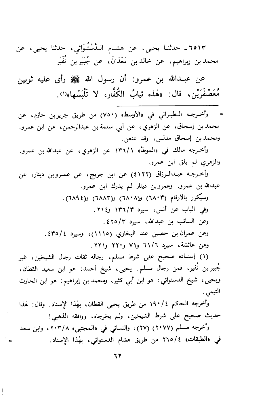 ٦٥١٣ - حَدَّثَنَا يَحْيَى، عَنْ هِشَامٍ الدَّسْتُوَائِيِّ، حَدَّثَنَا يَحْيَى، عَنْ مُحَمَّدِ بْنِ إِبْرَاهِيمَ، عَنْ خَالِدِ بْنِ مَعْدَانَ، عَنْ جُبَيْرِ بْنِ نُفَيْرٍ، عَنْ عَبْدِ اللهِ بْنِ عَمْرٍو، أَنَّ رَسُولَ اللهِ صَلَّى اللهُ عَلَيْهِ وَسَلَّمَ رَأَى عَلَيْهِ ثَوْبَيْنِ مُعَصْفَرَيْنِ قَالَ: " هَذِهِ ثِيَابُ الْكُفَّارِ لَا تَلْبَسْهَا " (١)