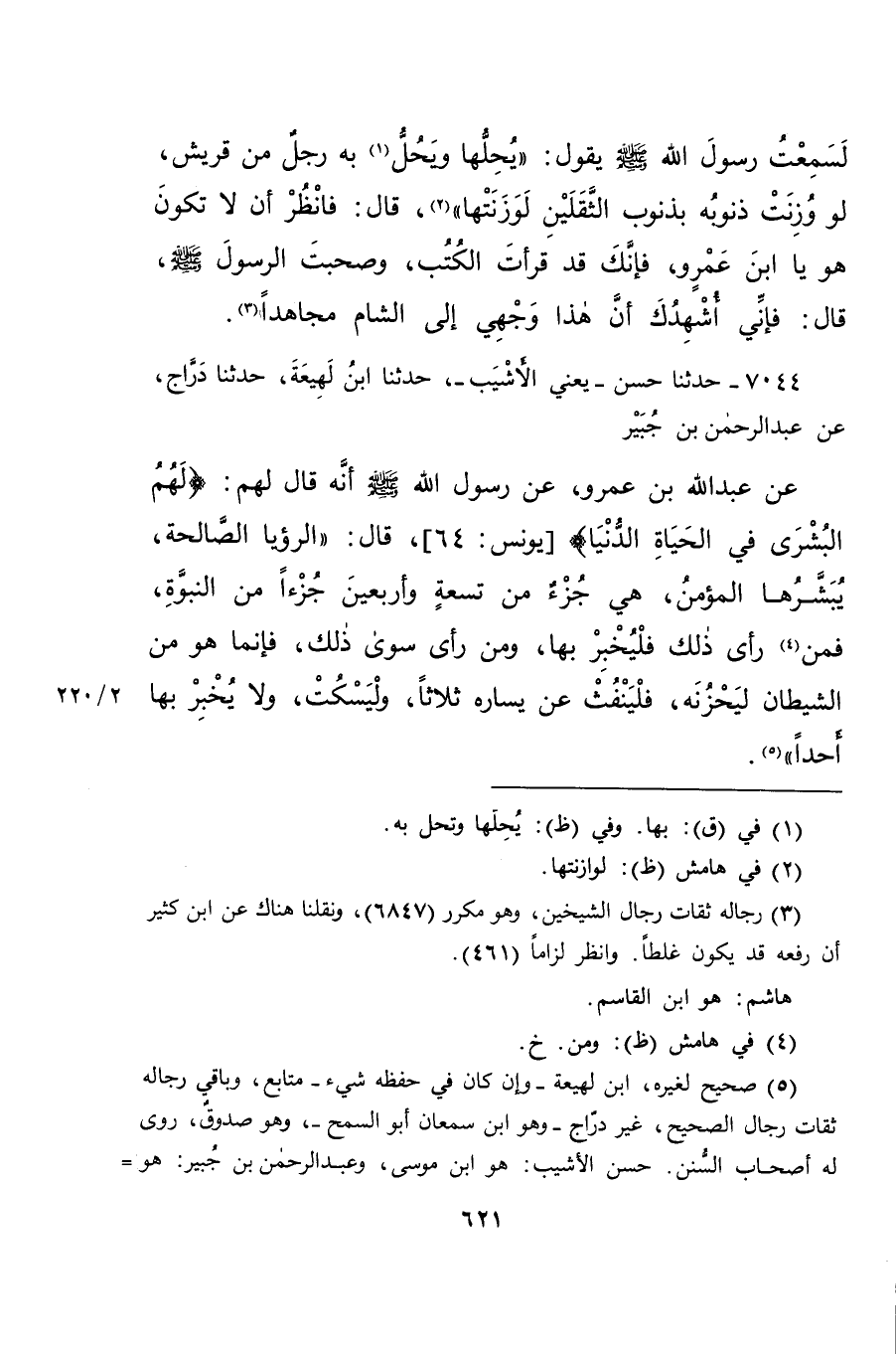 ٧٠٤٤ - حَدَّثَنَا حَسَنٌ يَعْنِي الْأَشْيَبَ، حَدَّثَنَا ابْنُ لَهِيعَةَ، حَدَّثَنَا دَرَّاجٌ، عَنْ عَبْدِ الرَّحْمَنِ بْنِ جُبَيْرٍ، عَنْ عَبْدِ اللهِ بْنِ عَمْرٍو، عَنْ رَسُولِ اللهِ صَلَّى اللهُ عَلَيْهِ وَسَلَّمَ، أَنَّهُ قَالَ: {لَهُمُ الْبُشْرَى فِي الْحَيَاةِ الدُّنْيَا} [يونس: ٦٤] ، قَالَ: " الرُّؤْيَا الصَّالِحَةُ، يُبَشَّرُهَا الْمُؤْمِنُ، هِيَ جُزْءٌ مِنْ تِسْعَةٍ وَأَرْبَعِينَ جُزْءًا مِنَ النُّبُوَّةِ، فَمَنْ (٤) رَأَى ذَلِكَ فَلْيُخْبِرْ بِهَا، وَمَنْ رَأَى سِوَى ذَلِكَ، فَإِنَّمَا هُوَ مِنَ الشَّيْطَانِ لِيُحْزِنَهُ، فَلْيَنْفُثْ عَنْ يَسَارِهِ ثَلَاثًا، وَلْيَسْكُتْ، وَلَا يُخْبِرْ بِهَا أَحَدًا " (٥)