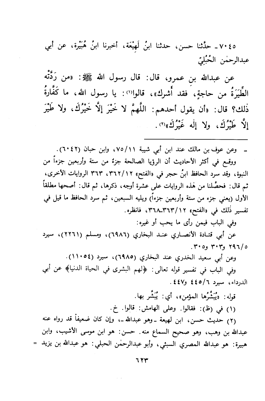 ٧٠٤٥ - حَدَّثَنَا حَسَنٌ، حَدَّثَنَا ابْنُ لَهِيعَةَ، أَخْبَرَنَا ابْنُ هُبَيْرَةَ، عَنْ أَبِي عَبْدِ الرَّحْمَنِ الْحُبُلِيِّ، عَنْ عَبْدِ اللهِ بْنِ عَمْرٍو، قَالَ: قَالَ رَسُولُ اللهِ صَلَّى اللهُ عَلَيْهِ وَسَلَّمَ: " مَنْ رَدَّتْهُ الطِّيَرَةُ مِنْ حَاجَةٍ، فَقَدْ أَشْرَكَ "، قَالُوا (١) : يَا رَسُولَ اللهِ، مَا كَفَّارَةُ ذَلِكَ؟ قَالَ: " أَنْ يَقُولَ أَحَدُهُمْ: اللهُمَّ لَا خَيْرَ إِلَّا خَيْرُكَ، وَلَا طَيْرَ إِلَّا طَيْرُكَ، وَلَا إِلَهَ غَيْرُكَ " (٢)