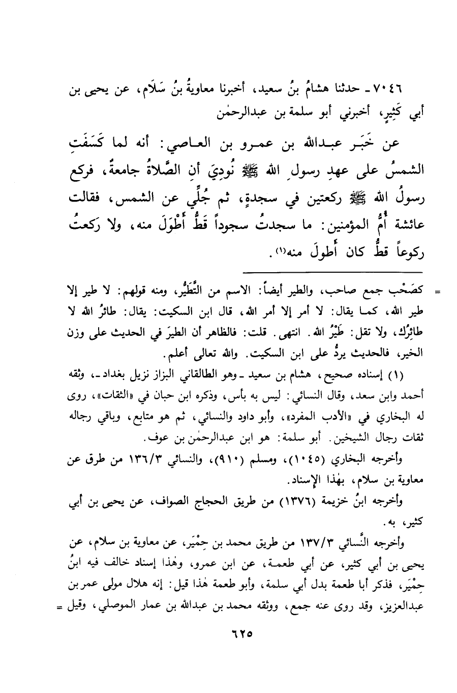 ٧٠٤٦ - حَدَّثَنَا هِشَامُ بْنُ سَعِيدٍ، أَخْبَرَنَا مُعَاوِيَةُ بْنُ سَلَّامٍ، عَنْ يَحْيَى بْنِ أَبِي كَثِيرٍ، أَخْبَرَنِي أَبُو سَلَمَةَ بْنُ عَبْدِ الرَّحْمَنِ، عَنْ خَبَرِ عَبْدِ اللهِ بْنِ عَمْرِو بْنِ الْعَاصِي، أَنَّهُ لَمَّا كَسَفَتِ الشَّمْسُ عَلَى عَهْدِ رَسُولِ اللهِ صَلَّى اللهُ عَلَيْهِ وَسَلَّمَ، نُودِيَ أَنِ الصَّلَاةُ جَامِعَةٌ، " فَرَكَعَ رَسُولُ اللهِ صَلَّى اللهُ عَلَيْهِ وَسَلَّمَ رَكْعَتَيْنِ فِي سَجْدَةٍ، ثُمَّ جُلِّيَ عَنِ الشَّمْسِ " فَقَالَتْ عَائِشَةُ أُمُّ الْمُؤْمِنِينَ: " مَا سَجَدْتُ سُجُودًا قَطُّ أَطْوَلَ مِنْهُ، وَلَا رَكَعْتُ رُكُوعًا قَطُّ كَانَ أَطْوَلَ مِنْهُ " (١)