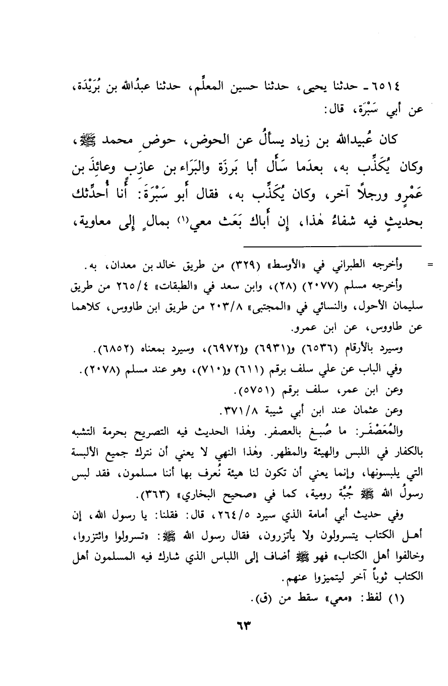 ٦٥١٤ - حَدَّثَنَا يَحْيَى، حَدَّثَنَا حُسَيْنٌ الْمُعَلِّمُ، حَدَّثَنَا عَبْدُ اللهِ بْنُ بُرَيْدَةَ، عَنْ أَبِي سَبْرَةَ، قَالَ: كَانَ عُبَيْدُ اللهِ بْنُ زِيَادٍ يَسْأَلُ عَنِ الْحَوْضِ، حَوْضِ مُحَمَّدٍ صَلَّى اللهُ عَلَيْهِ وَسَلَّمَ، وَكَانَ يُكَذِّبُ بِهِ، بَعْدَمَا سَأَلَ أَبَا بَرْزَةَ وَالْبَرَاءَ بْنَ عَازِبٍ وعَائِذَ بْنَ عَمْرٍو وَرَجُلًا آخَرَ، وَكَانَ يُكَذِّبُ بِهِ، فَقَالَ أَبُو سَبْرَةَ: أَنَا أُحَدِّثُكَ بِحَدِيثٍ فِيهِ شِفَاءُ هَذَا، إِنَّ أَبَاكَ بَعَثَ مَعِي (١) بِمَالٍ إِلَى مُعَاوِيَةَ،