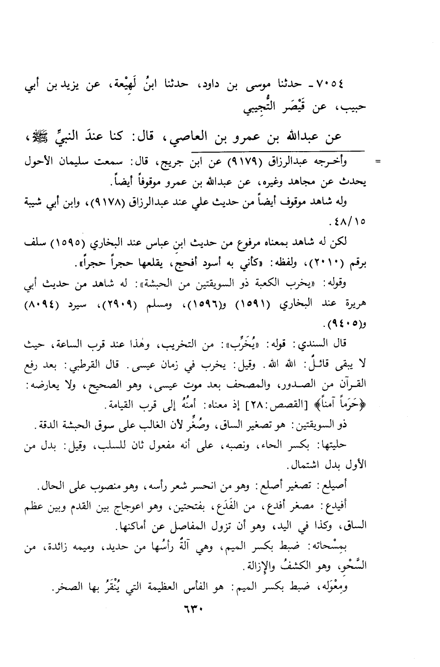 وقوله: "يخرب الكعبة ذو السويقتين من الحبشة": له شاهد من حديث أبي هريرة عند البخاري (١٥٩١) و (١٥٩٦) ، ومسلم (٢٩٠٩) ، سيرد (٨٠٩٤) و (٩٤٠٥) .