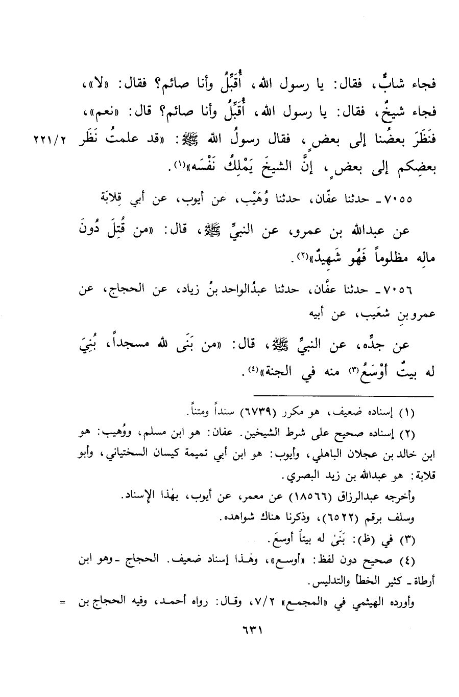 ٧٠٥٥ - حَدَّثَنَا عَفَّانُ، حَدَّثَنَا وُهَيْبٌ، عَنْ أَيُّوبَ، عَنْ أَبِي قِلَابَةَ، عَنْ عَبْدِ اللهِ بْنِ عَمْرٍو، عَنِ النَّبِيِّ صَلَّى اللهُ عَلَيْهِ وَسَلَّمَ قَالَ: " مَنْ قُتِلَ دُونَ مَالِهِ مَظْلُومًا فَهُوَ شَهِيدٌ " (٢)