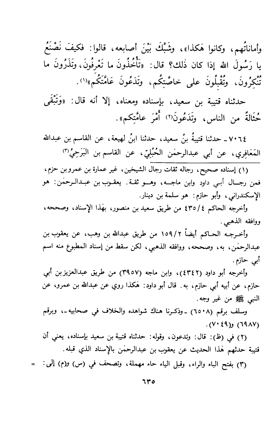 ٧٠٦٤ - حَدَّثَنَا قُتَيْبَةُ بْنُ سَعِيدٍ، حَدَّثَنَا ابْنُ لَهِيعَةَ، عَنِ الْقَاسِمِ بْنِ عَبْدِ اللهِ الْمَعَافِرِيِّ، عَنْ أَبِي عَبْدِ الرَّحْمَنِ الْحُبُلِيِّ، عَنِ الْقَاسِمِ بْنِ الْبَرْحِيِّ، (٣)