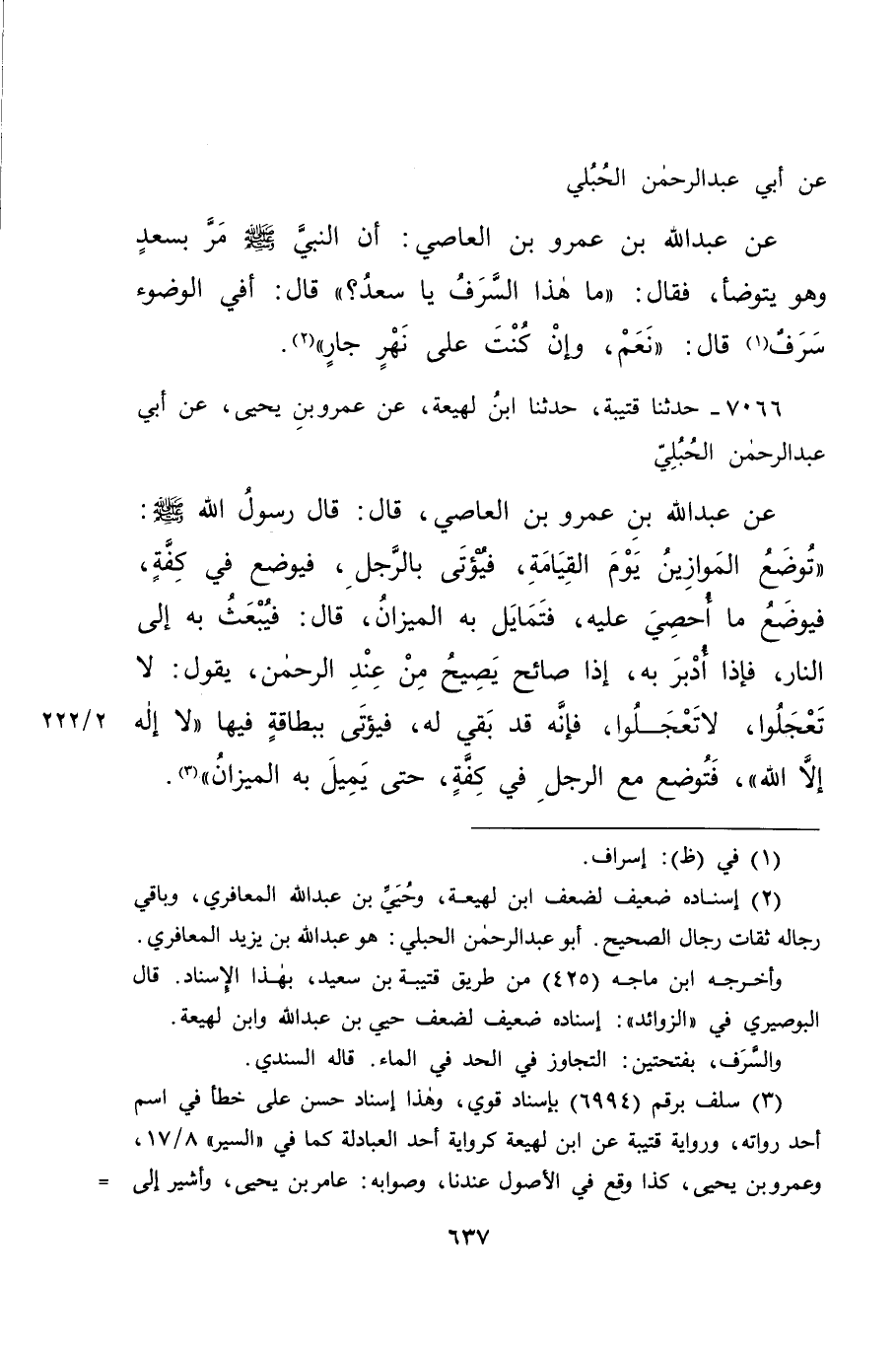 عَنْ أَبِي عَبْدِ الرَّحْمَنِ الْحُبُلِيِّ، عَنْ عَبْدِ اللهِ بْنِ عَمْرِو بْنِ الْعَاصِي، أَنَّ النَّبِيَّ صَلَّى اللهُ عَلَيْهِ وَسَلَّمَ مَرَّ بِسَعْدٍ وَهُوَ يَتَوَضَّأُ، فَقَالَ: " مَا هَذَا السَّرَفُ يَا سَعْدُ؟ " قَالَ: أَفِي الْوُضُوءِ سَرَفٌ (١) ؟ قَالَ: " نَعَمْ، وَإِنْ كُنْتَ عَلَى نَهْرٍ جَارٍ " (٢)